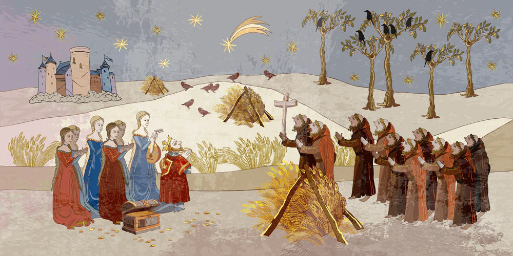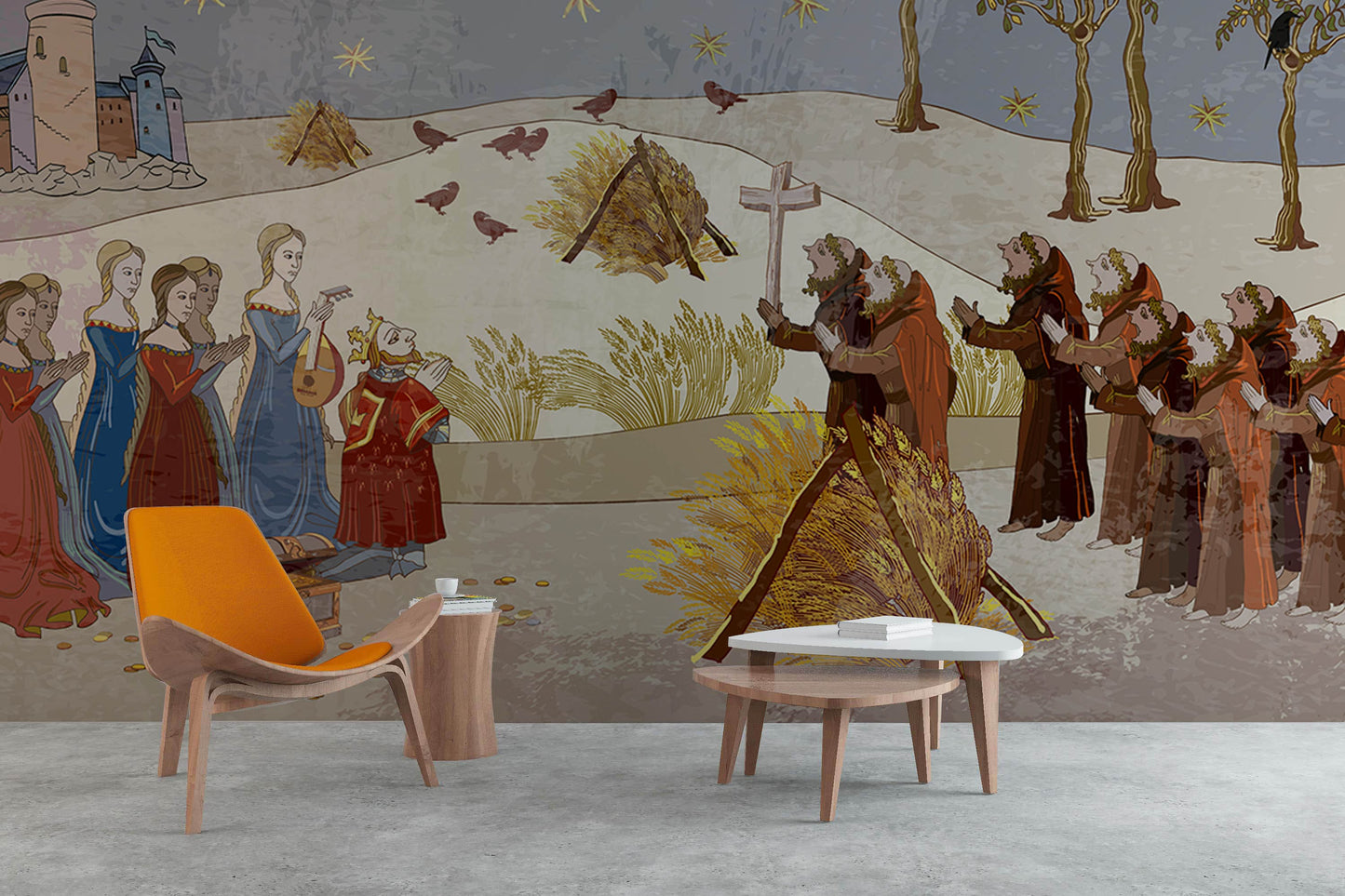 Immergez votre espace dans l'enchantement du monde des époques révolues avec notre papier peint Scène de Conteur Médiéval. Parfait pour créer une ambiance unique et intemporelle, sa palette de couleurs douces et son style d'illustration de conte de fées ajoutent une touche de charme historique à n'importe quelle pièce.