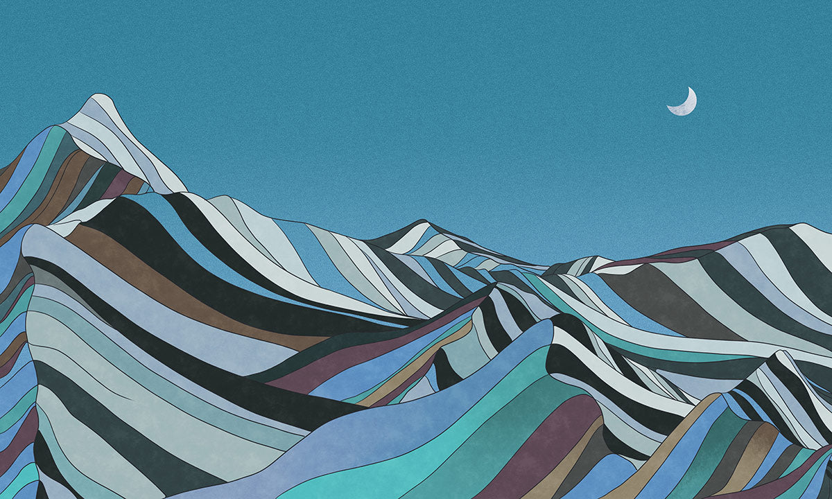 Rehaussez votre espace avec ce papier peint lignes ondulées abstraites mettant en vedette un mélange harmonieux de nuances de bleu et de motifs dynamiques imitant des collines ondulantes sous une lune croissante. Parfait pour ajouter une touche d'art moderne à votre maison.