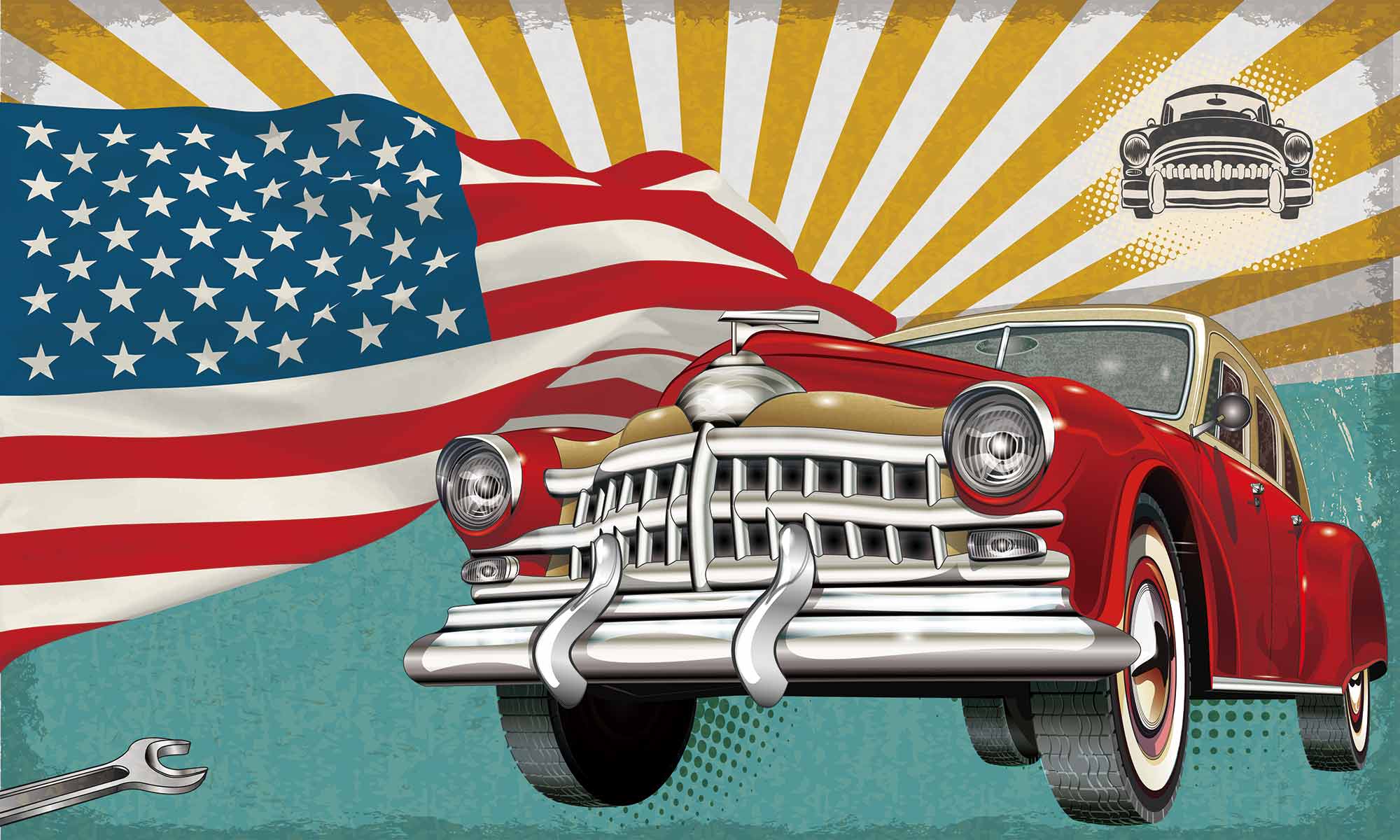 Apportez une ambiance classique à votre espace avec notre papier peint de voiture drapeau américain rétro, parfait pour ajouter une touche de nostalgie. L'automobile vintage et le décor emblématique créeront une déclaration audacieuse dans n'importe quelle pièce.