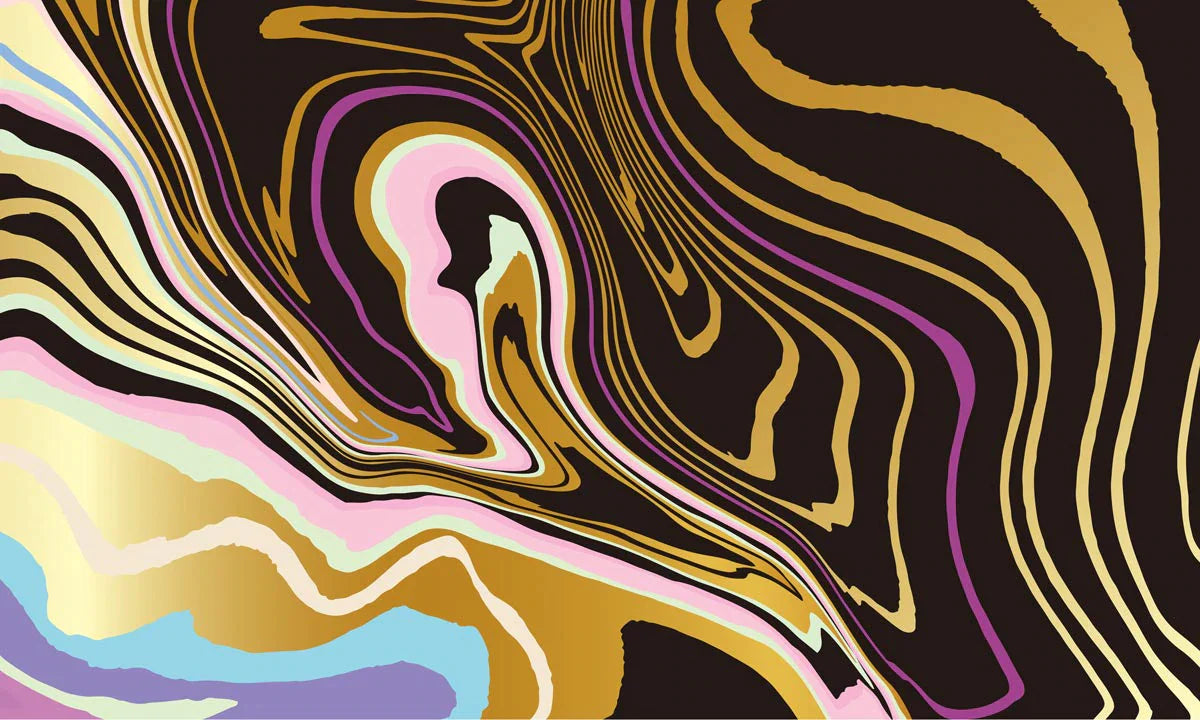 Élevez votre espace avec notre papier peint abstrait à lignes ondulées dorées, mettant en vedette des tourbillons riches de nuances noires, dorées et pastel. Parfait pour créer un mur d'accent vibrant qui dégage une élégance moderne et un flux dynamique. Ajoute une touche luxueuse à n'importe quelle pièce.