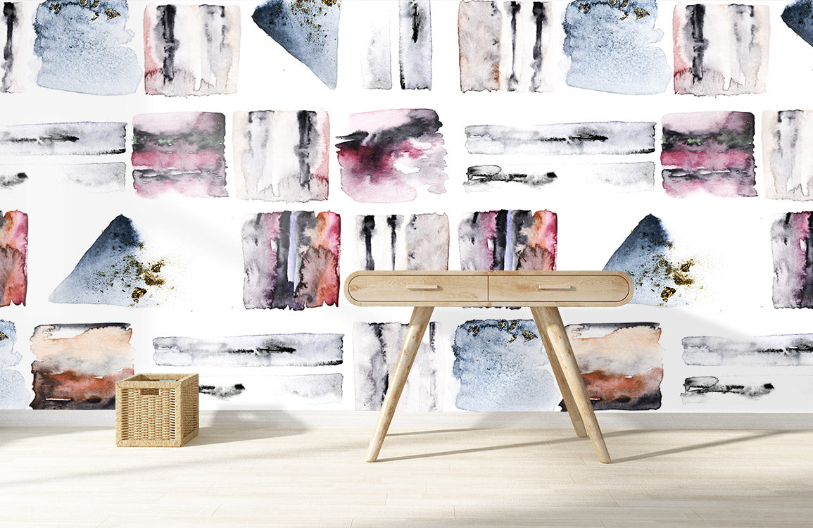 Rehaussez votre espace avec notre papier peint géométrique abstrait, mettant en vedette un mélange de tons aquarelle rehaussés de touches dorées. Parfait pour une touche artistique dans les salons, salles de bains et chambres à coucher.