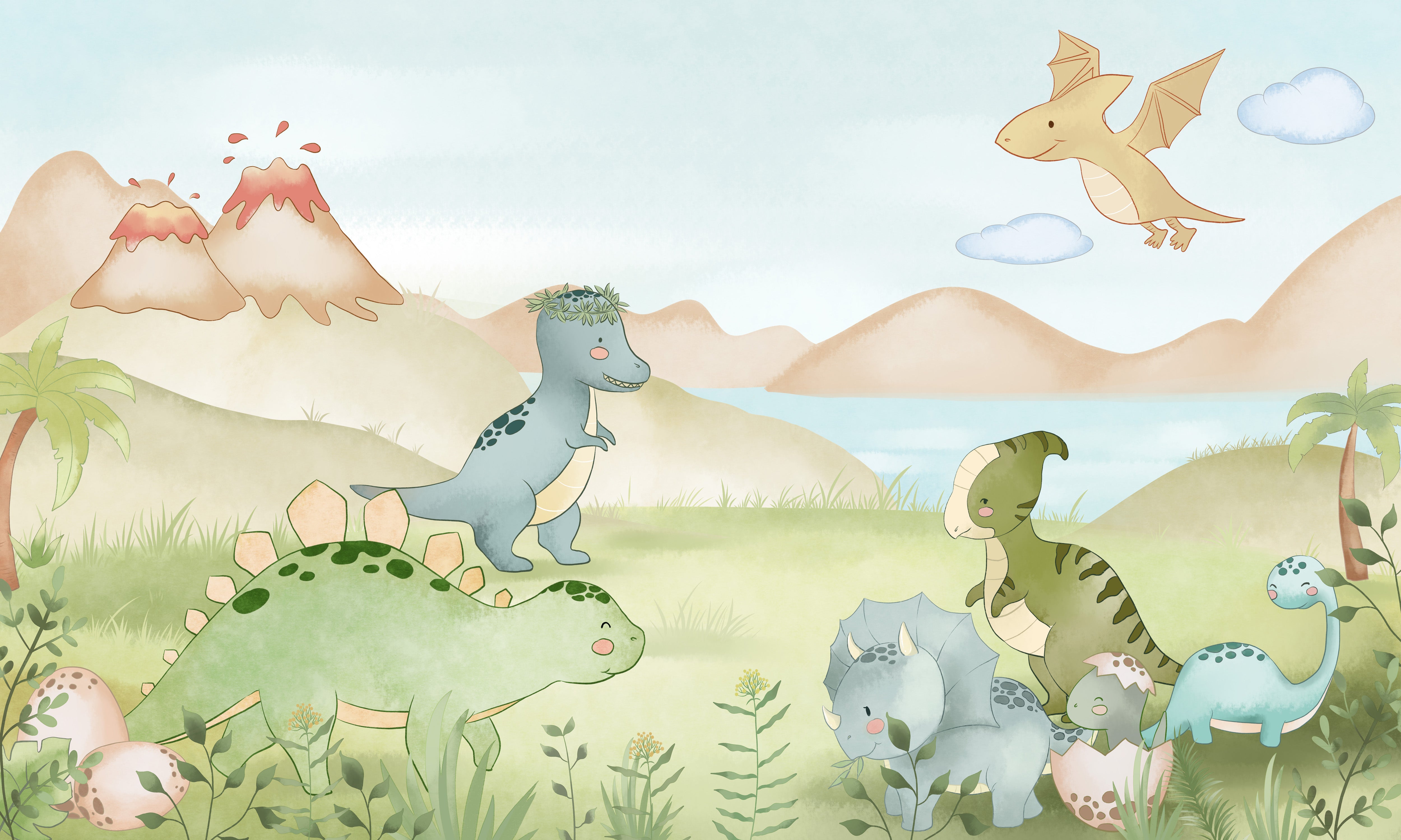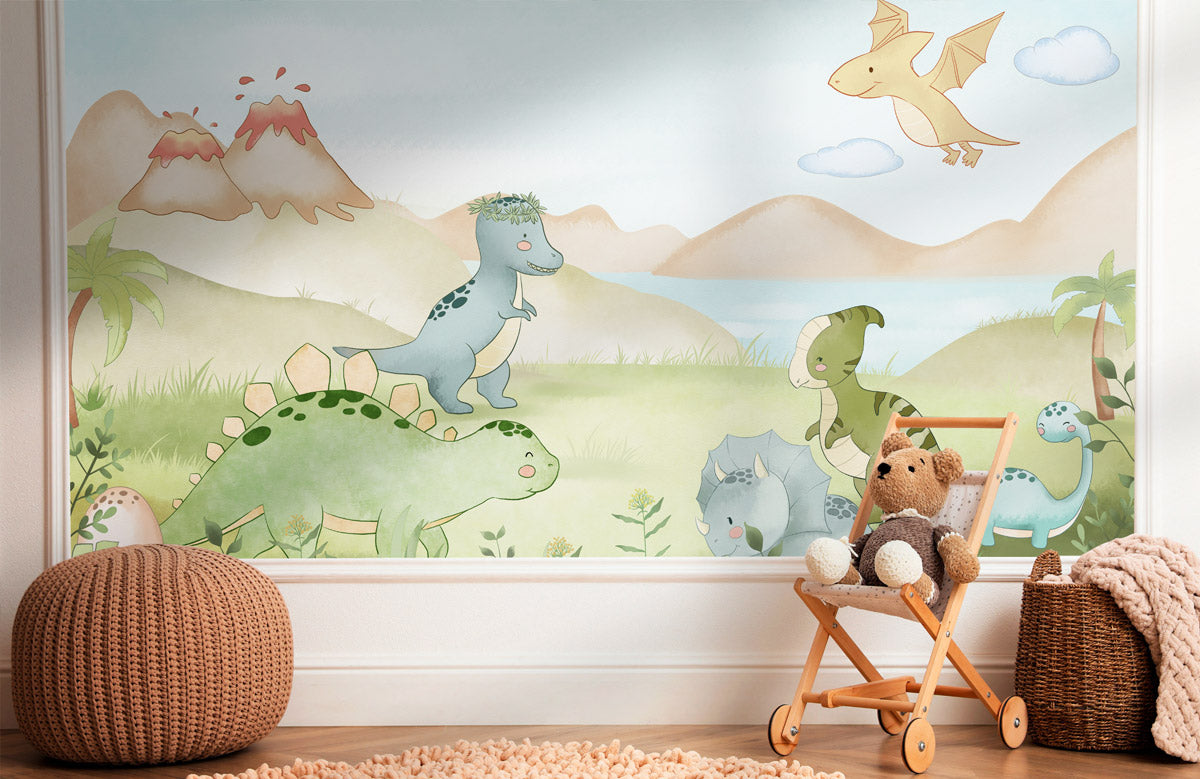 Avec ces jeunes dinosaures jouant près du lac, vous pouvez offrir à vos enfants une belle chambre. La chambre de vos enfants aura un effet apaisant grâce à cette fresque murale, qui les aidera à dormir paisiblement la nuit. Les couleurs de la fresque sont apaisantes et réconfortantes. Les couleurs pastel du papier peint rendront vos enfants heureux dans leur petit espace. L'utilisation de rideaux en mousseline blanche et d'un lit en bois blanc dans un schéma de couleurs crème crée une vue de chambre propre et attrayante.