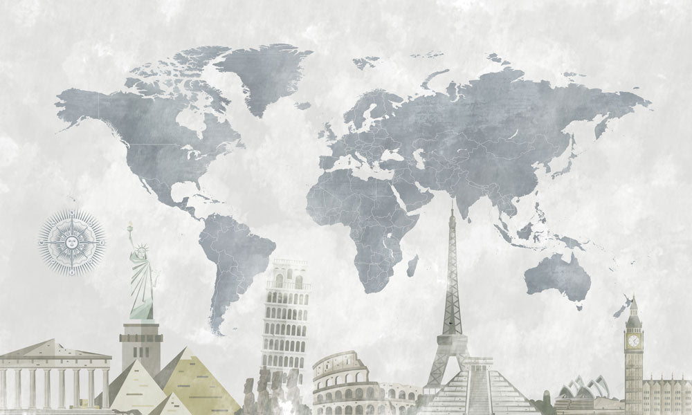 Découvrez l'élégance internationale avec notre papier peint abstrait gris représentant les monuments du monde. Parfait pour apporter un charme sophistiqué à tout espace, ce papier peint présente des structures emblématiques sur un fond de carte atténué. Idéal pour un bureau ou un salon, il ajoute une touche de désir d'ailleurs à votre décoration.