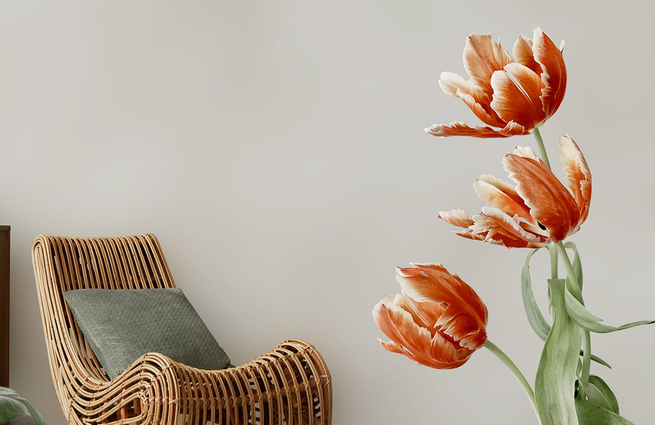 Élégamment conçus, ce papier peint d'art botanique Orange Tulips ajoute une touche de tranquillité naturelle à n'importe quel espace. Les tons chauds d'orange complétés par de subtils détails blancs offrent un fond apaisant, parfait pour les pièces de style moderne ou vintage.