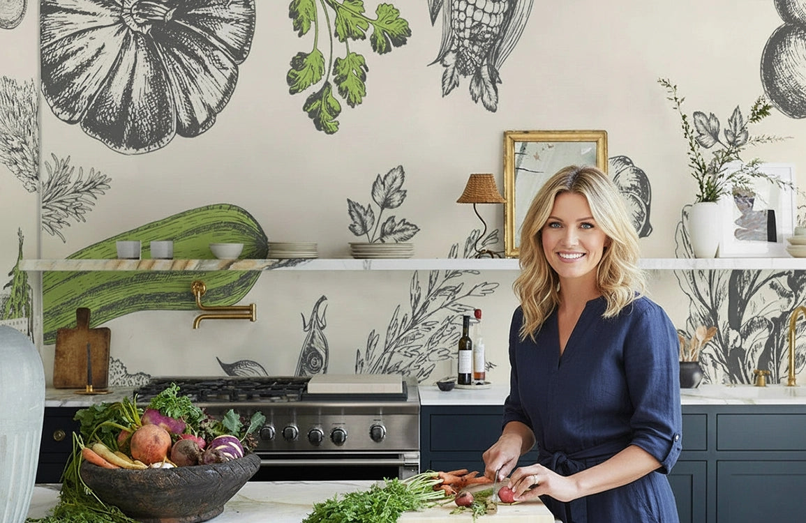 Amenez la beauté de la nature à l'intérieur avec notre papier peint de cuisine aux légumes botaniques. Parfait pour créer une atmosphère fraîche et organique, cette illustration détaillée présente une variété de légumes de jardin, ajoutant une touche de fantaisie et de charme rustique à votre cuisine ou salle à manger.