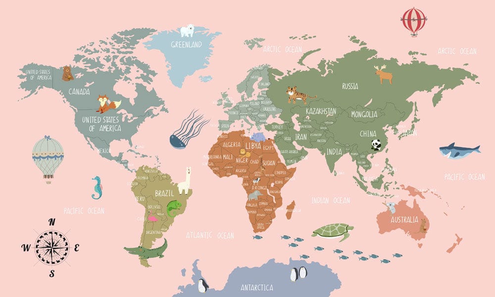 Embarquez pour une aventure mondiale depuis le confort de votre maison avec notre papier peint de carte du monde vibrant et éducatif. Parfait pour susciter la curiosité et la créativité des jeunes esprits, ce design ludique présente des illustrations engageantes d'animaux et de sites remarquables.