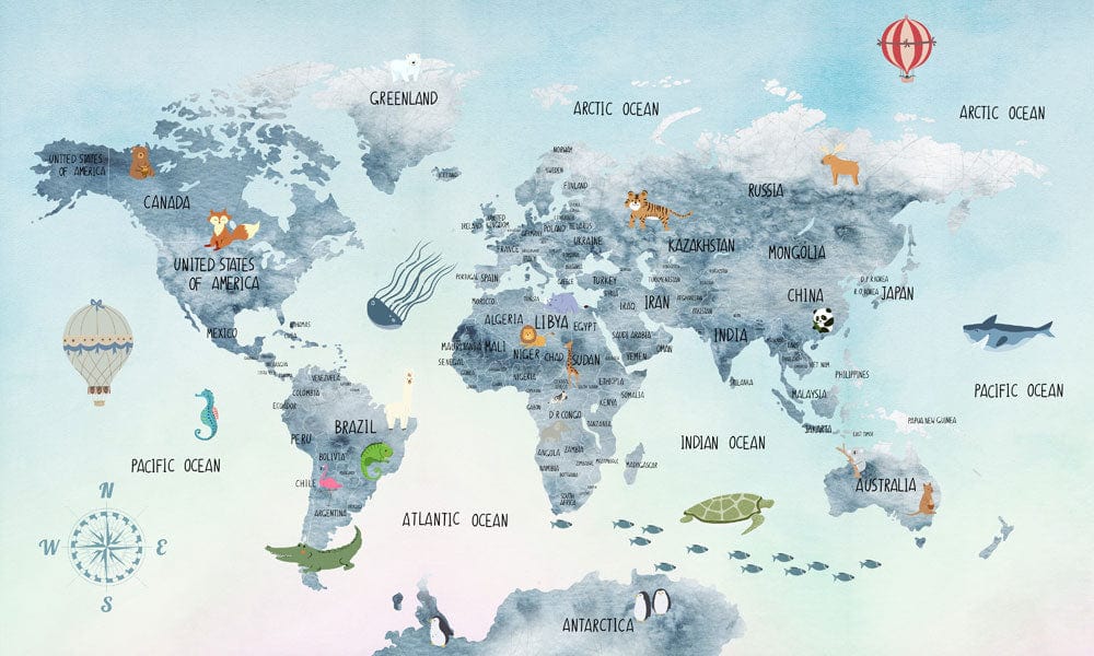 Apportez le monde dans la chambre de votre petit avec ce papier peint coloré et éducatif de la carte du monde. Doté d'illustrations amusantes d'animaux, de monuments et d'icônes culturelles, il est parfait pour susciter la curiosité et l'apprentissage.
