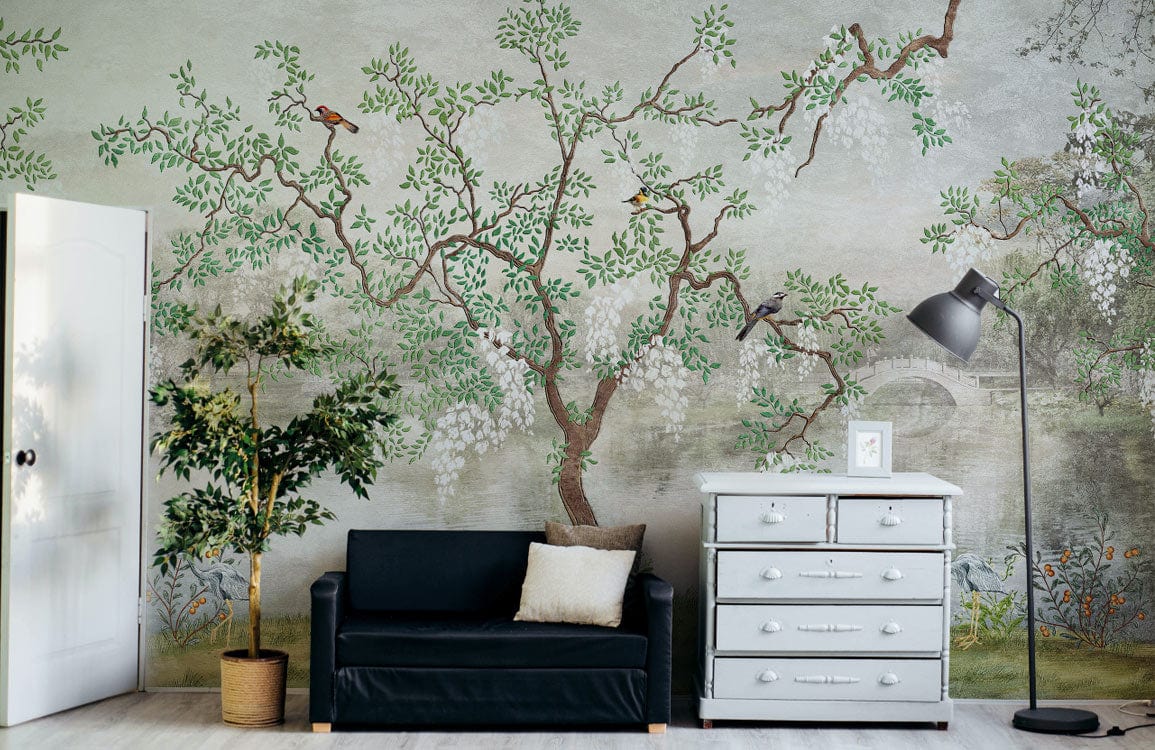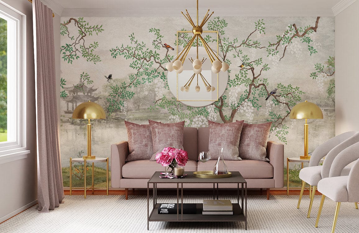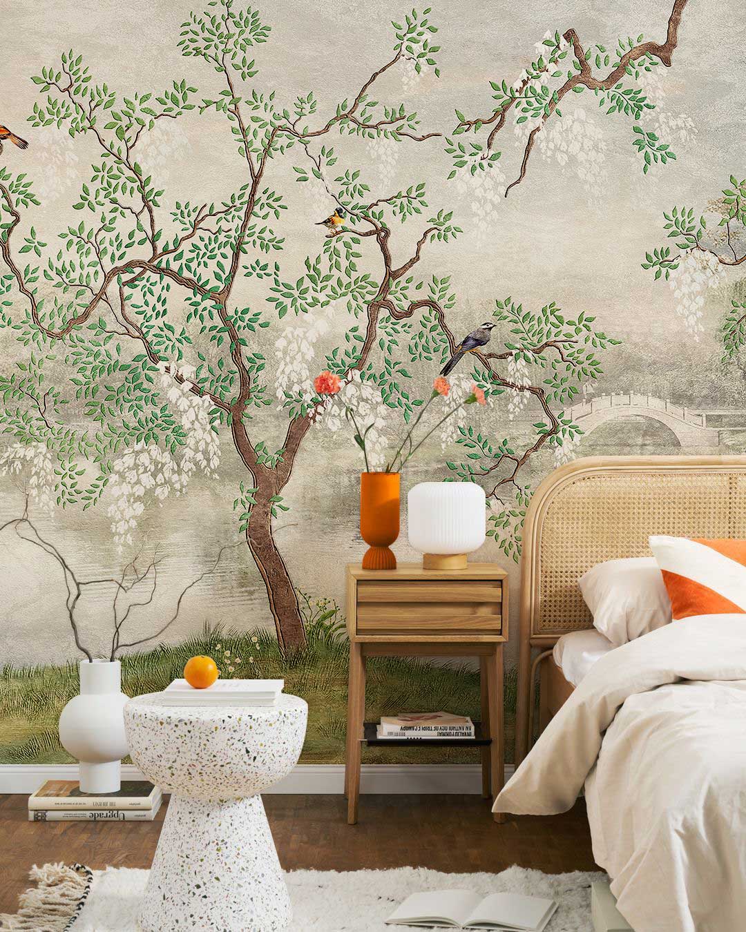 Apportez de la tranquillité à votre espace avec notre papier peint de paysage d'inspiration asiatique. Ce design présente des scènes de nature élégantes avec des arbres en fleurs et des pavillons paisibles, parfaits pour créer un arrière-plan serein dans n'importe quelle pièce.