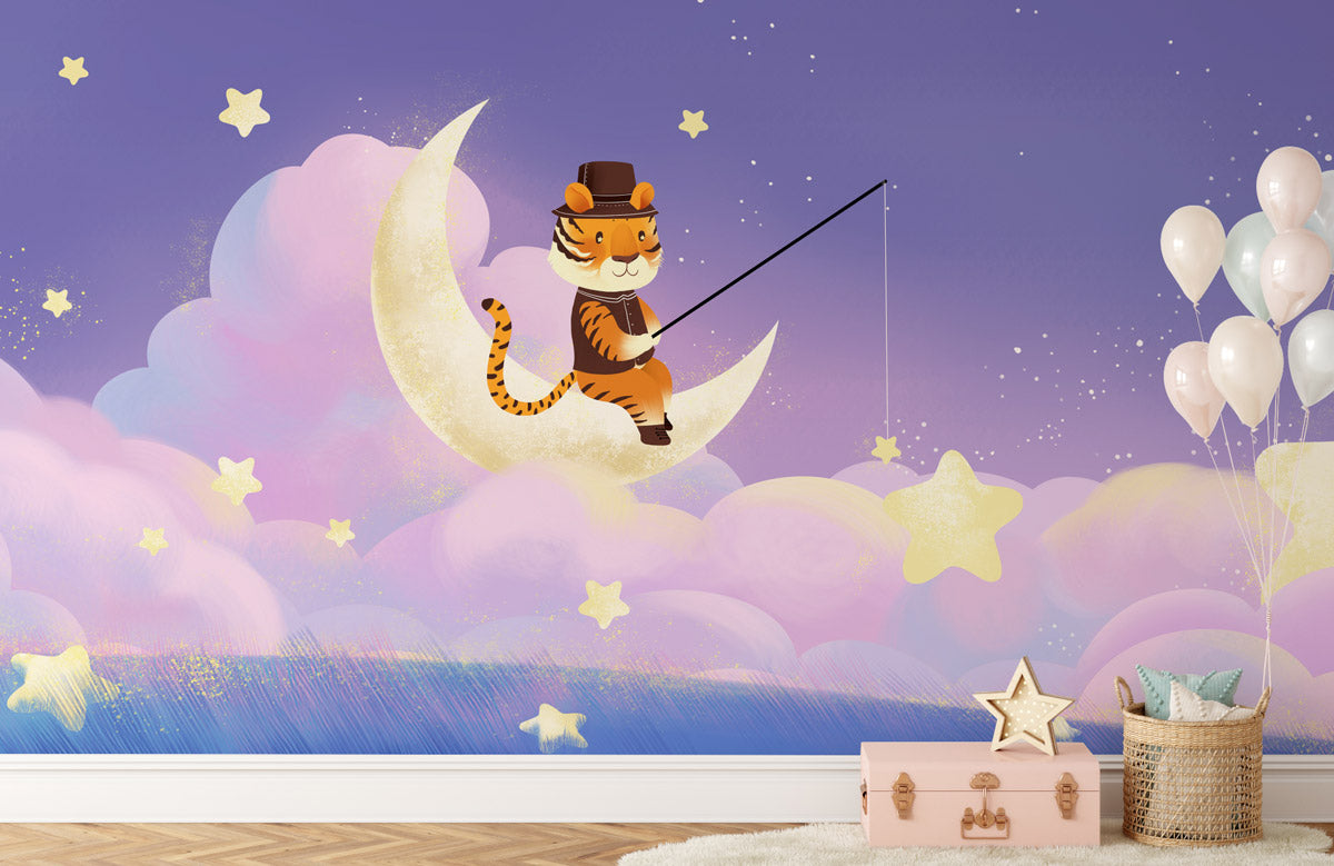 Transformez la chambre de votre enfant avec ce papier peint enchanteur mettant en scène un chat fantaisiste pêchant sur la lune. Situé au milieu d'un décor de doux nuages et d'étoiles scintillantes, il crée une atmosphère sereine et imaginative pour toute chambre d'enfant.
