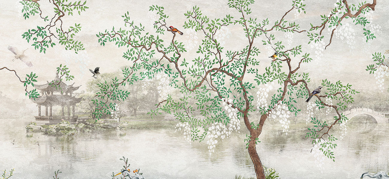 Sfondo Murale Elegante con Rami di Fiori e Uccelli