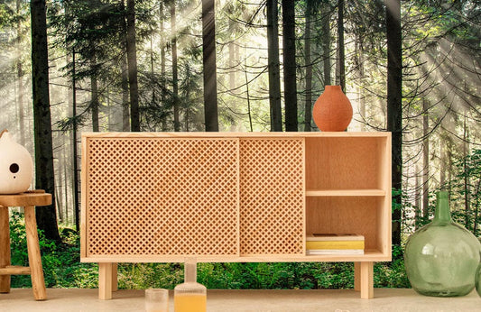 Muraale con paesaggio forestale illuminato dal sole