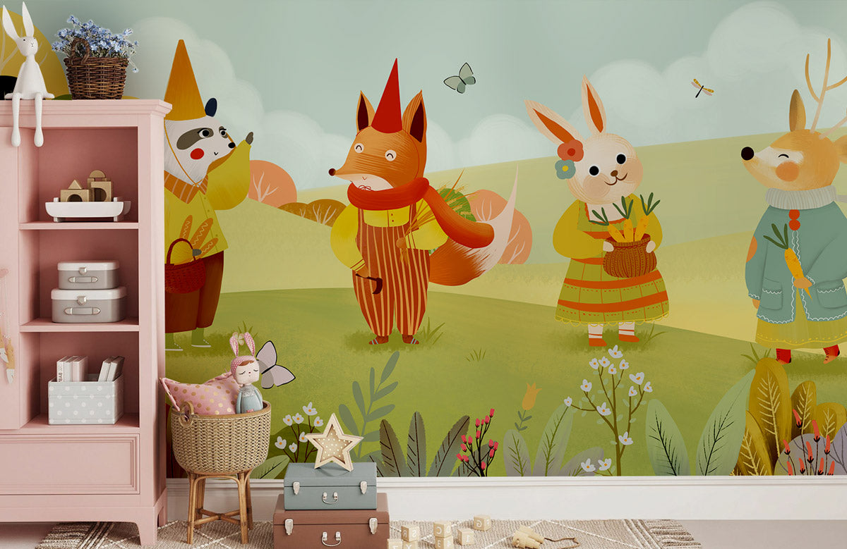 Trasforma la camera del tuo bambino o la nursery in un incantevole bosco con la nostra carta da parati per bambini Ever Wallpaper con animali del bosco fantasiosi. Questo affascinante rivestimento murale presenta creature boschive stilizzate e giocose in colori tenui e pastello, ideali per ispirare immaginazione e tranquillità.