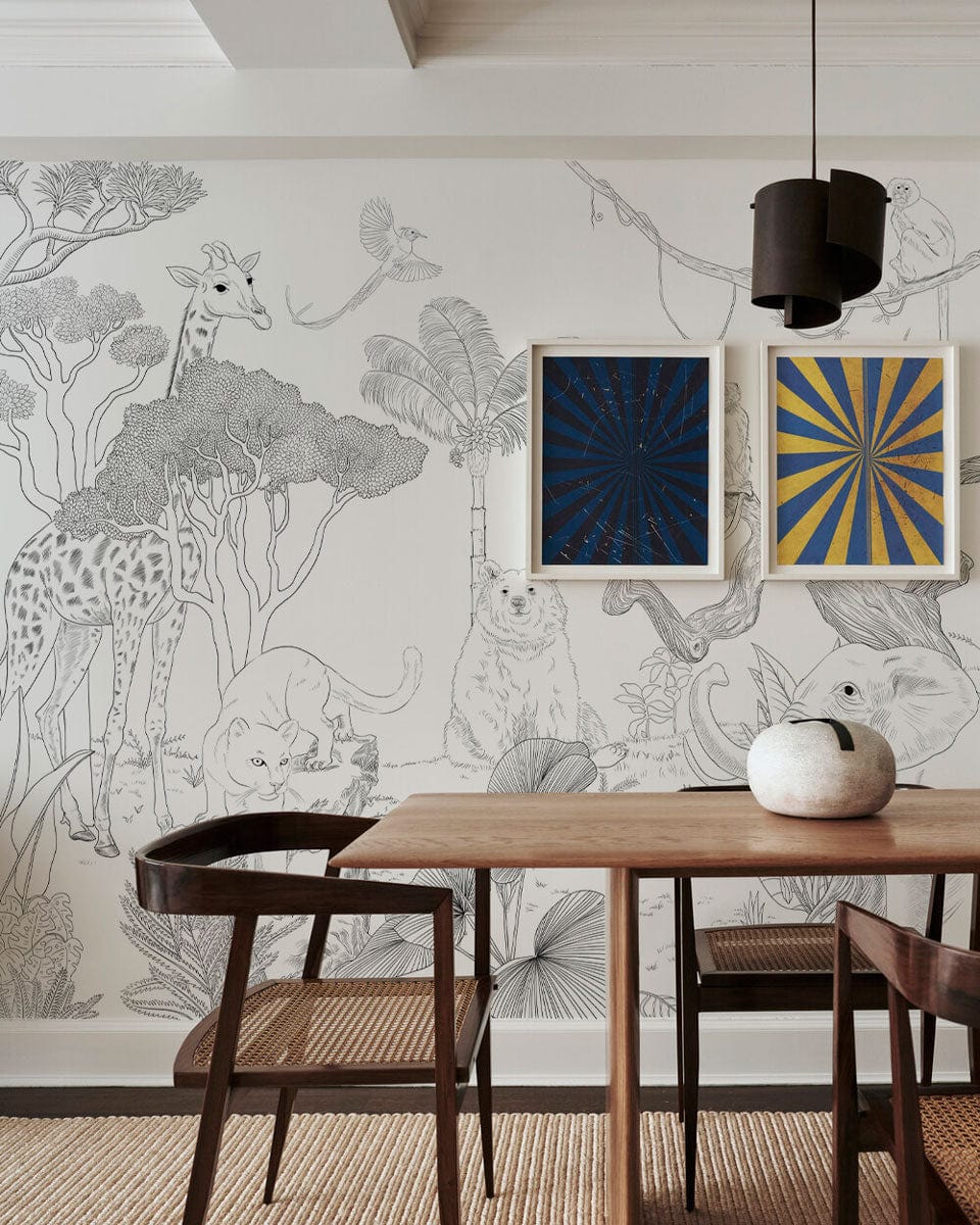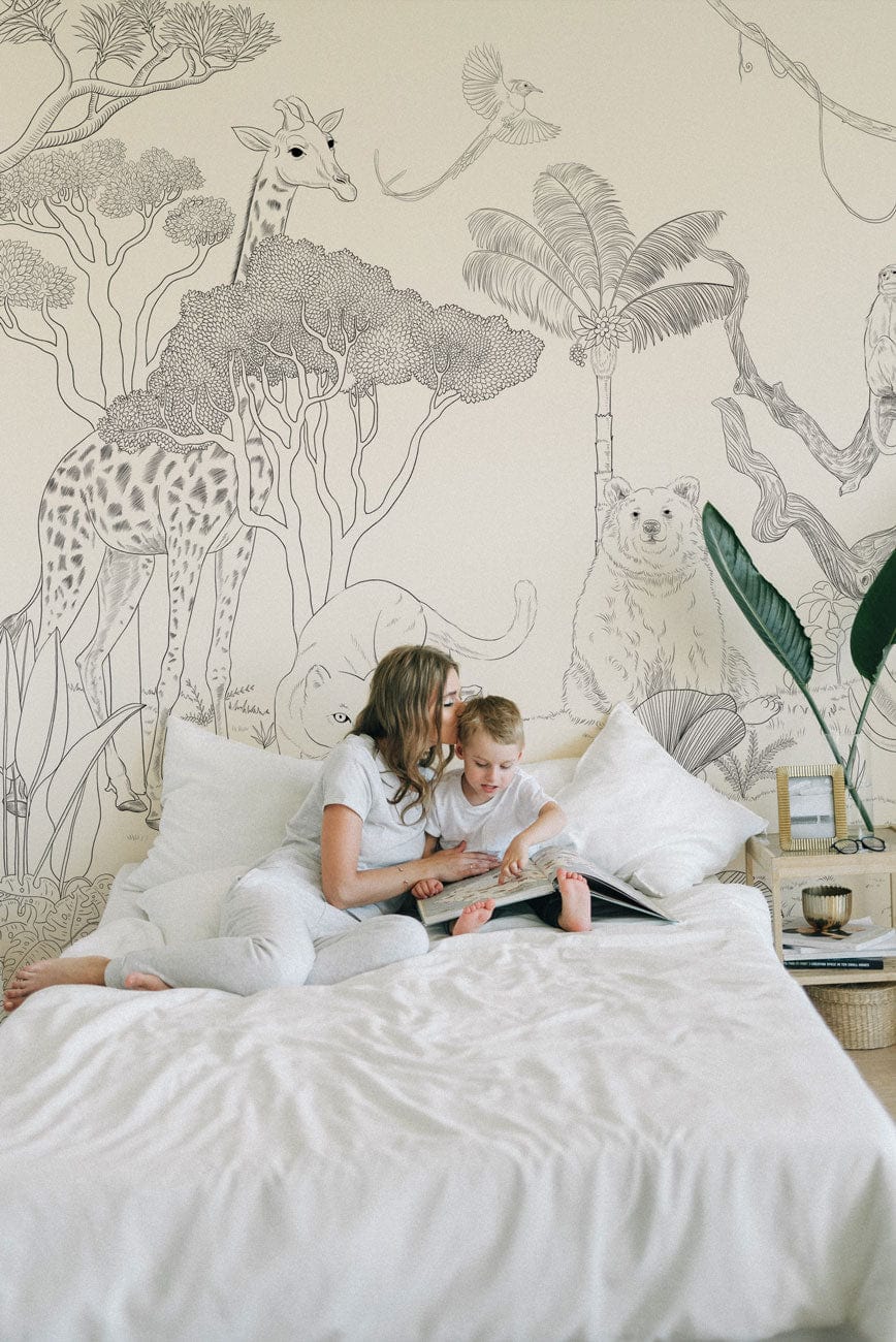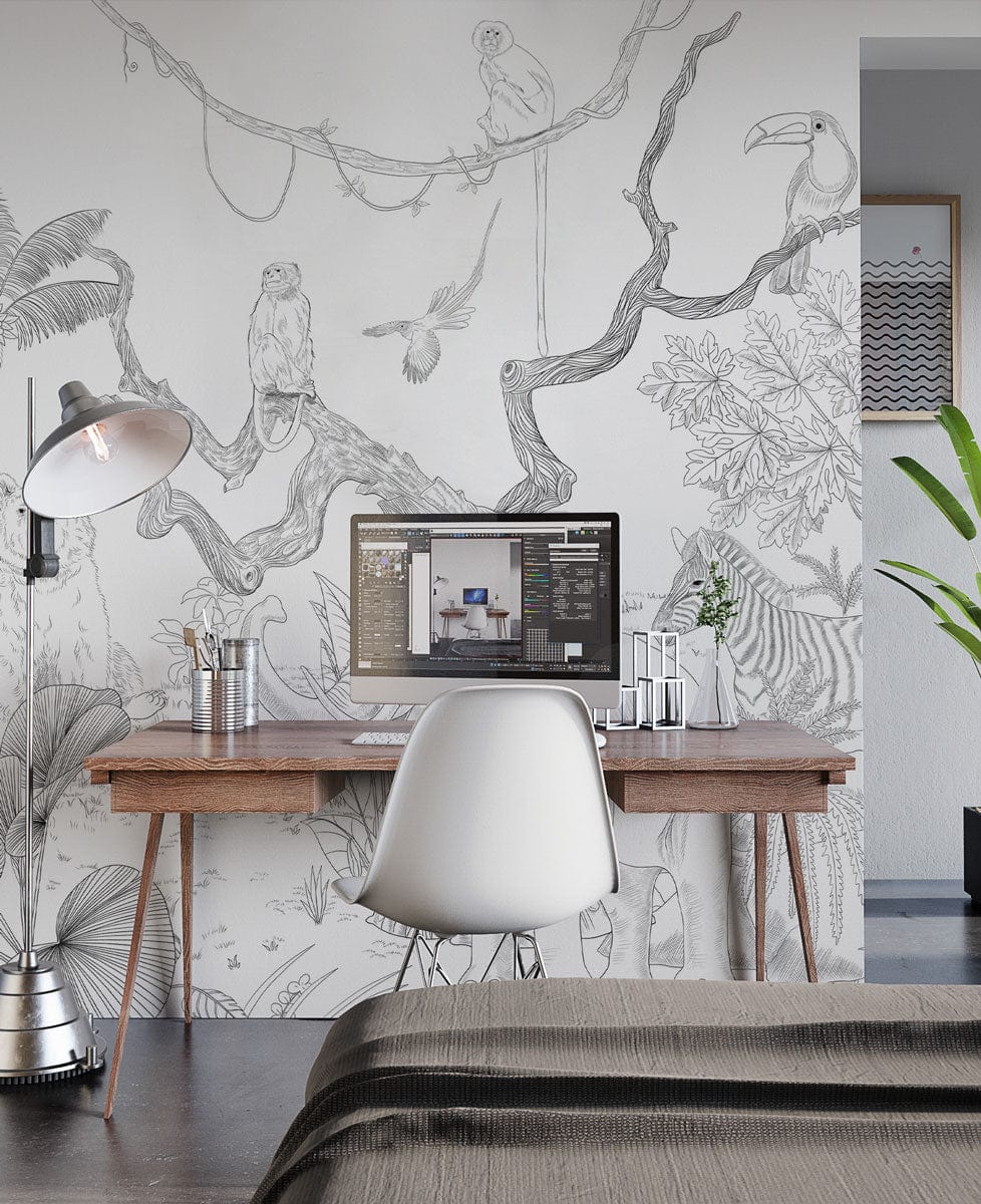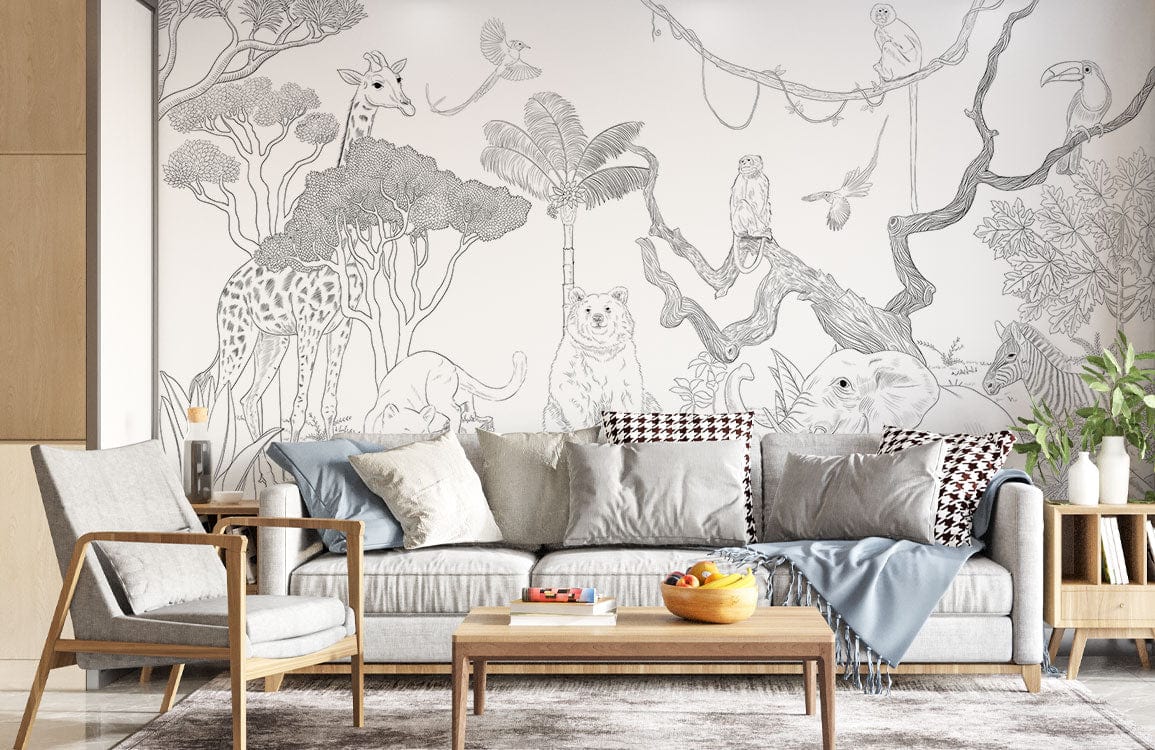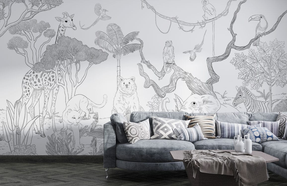 Scopri il fascino degli animali safari disegnati a mano con la nostra carta da parati Safari Adventure Sketch, perfetta per stimolare l'immaginazione in asili e sale giochi. La palette bianco e nero offre versatilità mentre aggiunge un tocco giocoso alla decorazione della tua stanza.