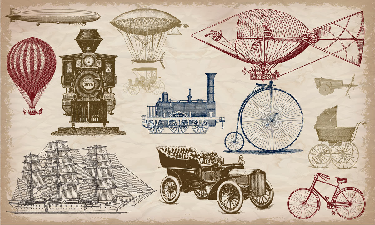 Evoca un senso di avventura e nostalgia con la nostra carta da parati Ever Wallpaper Vintage Transport Illustration. Perfetta per aggiungere un tocco classico a qualsiasi interno, questa carta da parati presenta palloni aerostatici, navi e veicoli antichi disegnati su uno sfondo beige senza tempo.