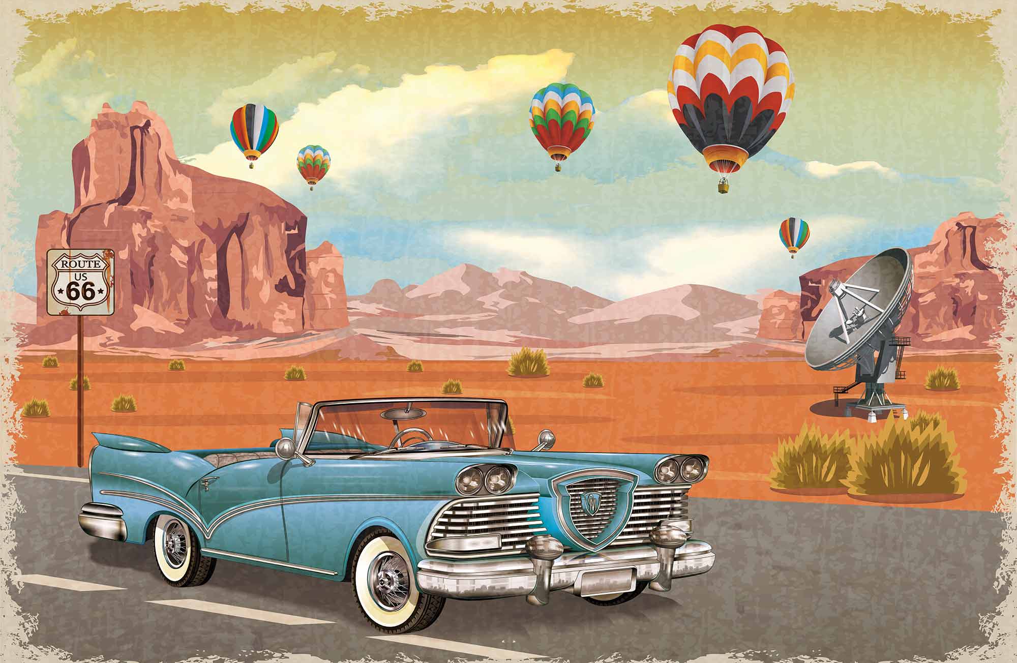 Intraprendi un viaggio nostalgico con la nostra carta da parati Scenic Wallpaper Vintage Route 66. Perfetta per aggiungere un'atmosfera retro a qualsiasi stanza, questa carta da parati cattura l'essenza del classico viaggio su strada americano con vivaci mongolfiere e iconici paesaggi desertici.