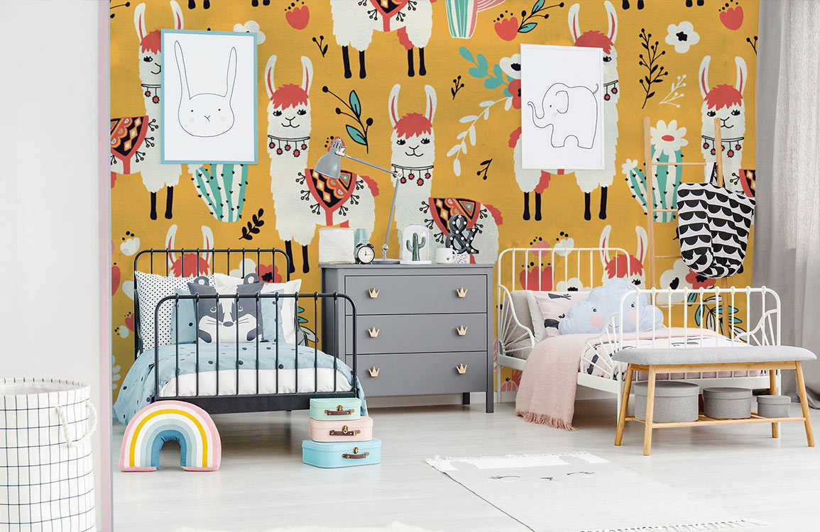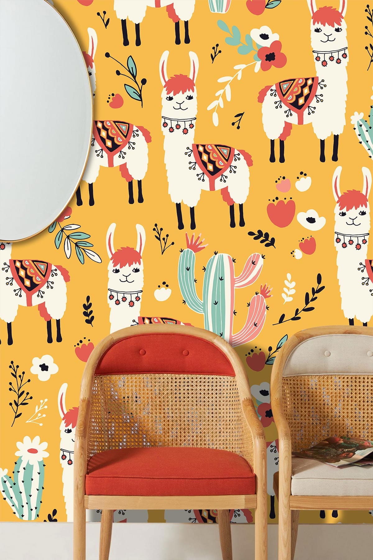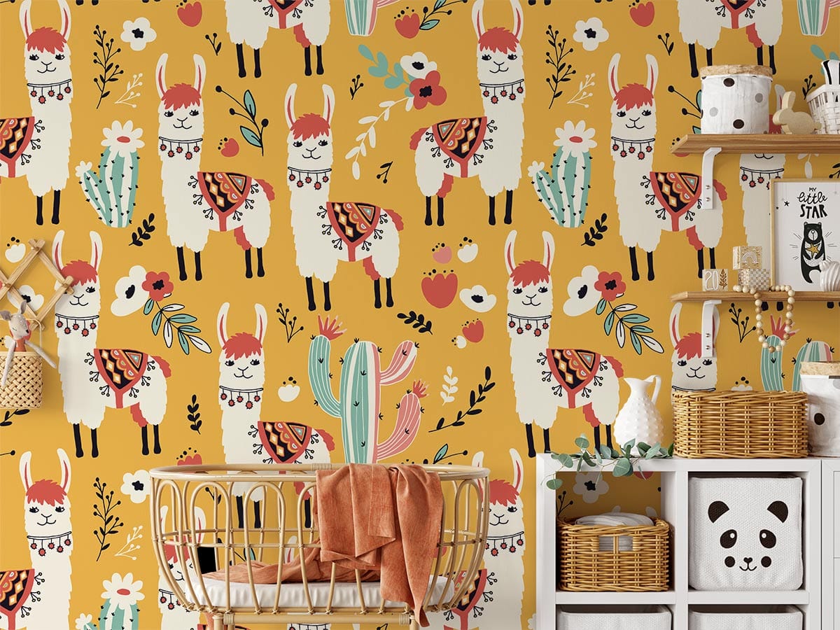 Illumina lo spazio di tuo figlio con la nostra carta da parati Ever Wallpaper per la cameretta dei bambini Cheerful Llama. Caratterizzata da lama giocose e cactus su uno sfondo giallo vibrante, questa carta da parati è perfetta per aggiungere un tocco di fantasia e colore a qualsiasi nursery o sala giochi.