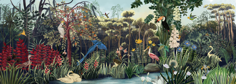 Trasforma il tuo spazio con questa vivace e lussureggiante carta da parati tropicale. Caratterizzata da un'array di uccelli esotici, ricca vegetazione e un sereno stagno, questa carta da parati aggiunge un tocco di bellezza naturale e tranquillità a qualsiasi stanza. Perfetta per creare un ambiente ispirato alla natura.