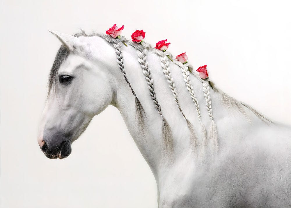 Immergi il tuo spazio nella bellezza serena della nostra Wallpaper Elegante Cavallo Bianco con Fiori, caratterizzata da un maestoso cavallo ornato di delicate rose rosse. Crea un'atmosfera tranquilla in qualsiasi stanza con questo design unico e riposante.