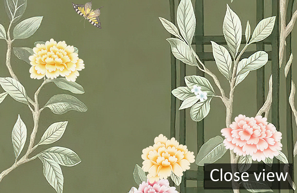 Trasforma il tuo spazio con il nostro Vintage Botanical Garden Floral Wallpaper, che presenta una combinazione affascinante di fiori delicati e un traliccio da giardino ben consolidato su uno sfondo verde sereno. Ideale per creare un'atmosfera accogliente e sofisticata in qualsiasi stanza.