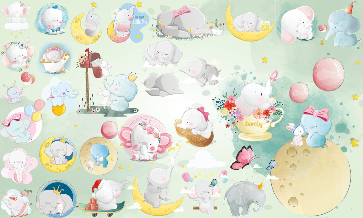 Goditi il fascino giocoso della nostra carta da parati per nursery Whimsical Baby Elephant, che presenta illustrazioni dai toni tenui di adorabili elefanti e dolci accenti celestiali. Perfetta per creare un'atmosfera serena e incantevole nella stanza del tuo bambino o nella nursery.
