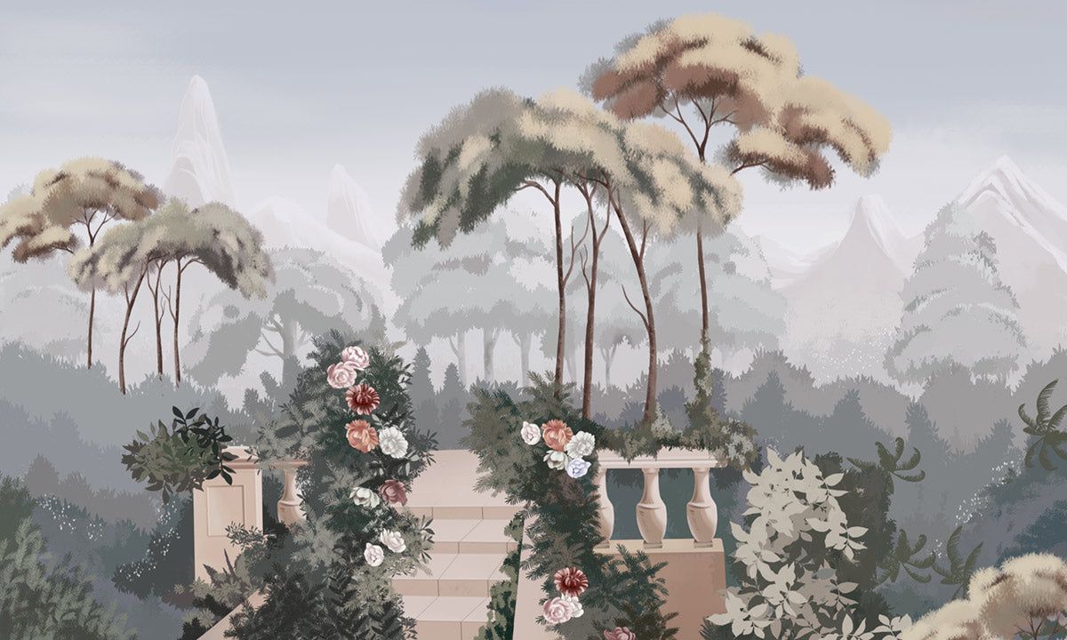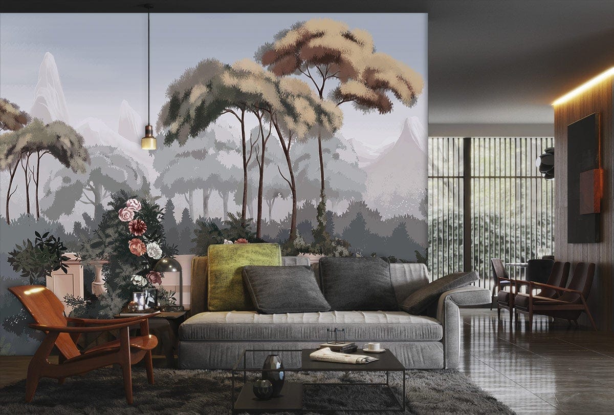 Eleva il tuo spazio con la nostra carta da parati Misty Mountain Floral Landscape, che presenta uno sfondo naturale sereno intrecciato con eleganti accenti floreali. Ideale per creare un'atmosfera pacifica e sofisticata, questa carta da parati porta un tocco di tranquillità naturale in qualsiasi stanza.