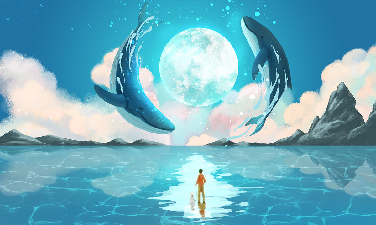 Questo incantevole wallpaper oceanico presenta maestosi cetacei in una danza al chiaro di luna, catturando un paesaggio marino sereno ma dinamico. Perfetto per creare un'atmosfera pacifica in qualsiasi spazio, i suoi colori vibranti portano vita e movimento alle tue pareti.
