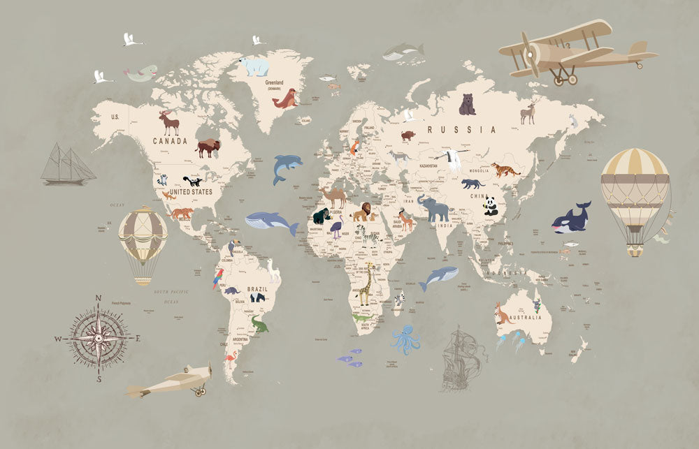 Esplora le meraviglie del mondo con la nostra carta da parati in stile vintage raffigurante una mappa del mondo, perfetta per le camere dei bambini e ambienti educativi. Questo design dettagliato e giocoso presenta animali e veicoli, rendendo l'apprendimento della geografia divertente e coinvolgente.