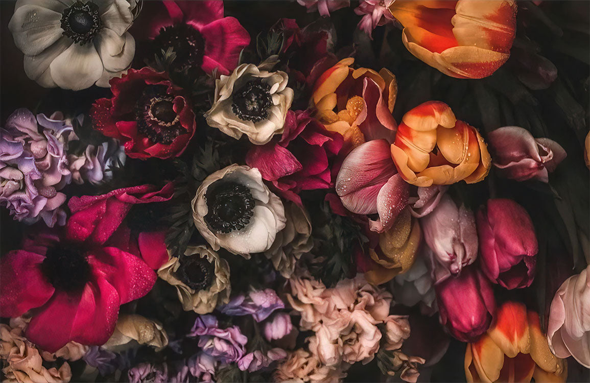 Porta la bellezza della primavera in casa con la nostra Lush Floral Blossom Wall Wallpaper. Perfetto per creare una parete d'accento vibrante, questo design presenta un ricco arazzo di fiori in piena fioritura in toni di rosso scuro, rosa e viola, accentuato da sottili accenni di verde.