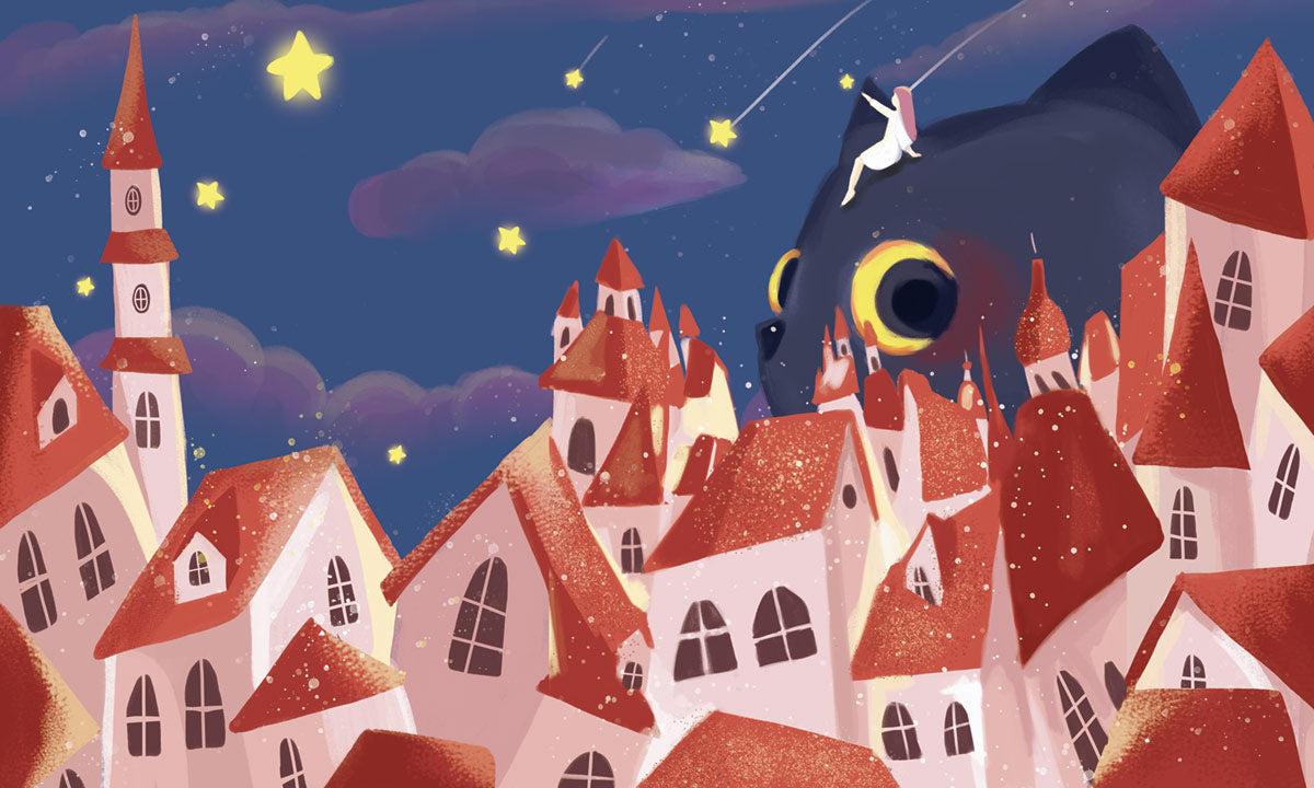 Trasforma il tuo spazio in un mondo magico con il nostro Ever Wallpaper Enchanted Fairytale Town. Perfetto per stimolare l'immaginazione, questo design presenta una città fantasiosa sotto un cielo notturno stellato, completa di una stella cadente e una palette di colori serena.