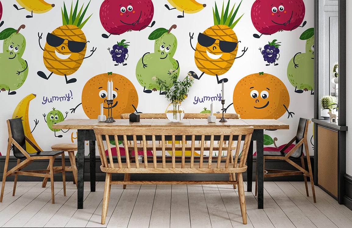 Ravviva il tuo spazio di cucina con la nostra carta da parati vivace e giocosa che presenta frutti dei cartoni animati con espressioni carine. Realizzata in materiale di alta qualità e durevole, questa carta da parati è perfetta per aggiungere un tocco di fantasia e colore alla tua cucina.
