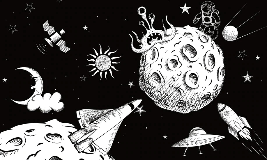 Accendi l'immaginazione con il nostro Outer Space Adventure Kids Wallpaper, che presenta illustrazioni stravaganti di corpi celesti e veicoli spaziali. Perfetto per creare uno sfondo divertente ed educativo nella stanza di un bambino, questa carta da parati è durevole e facile da pulire.