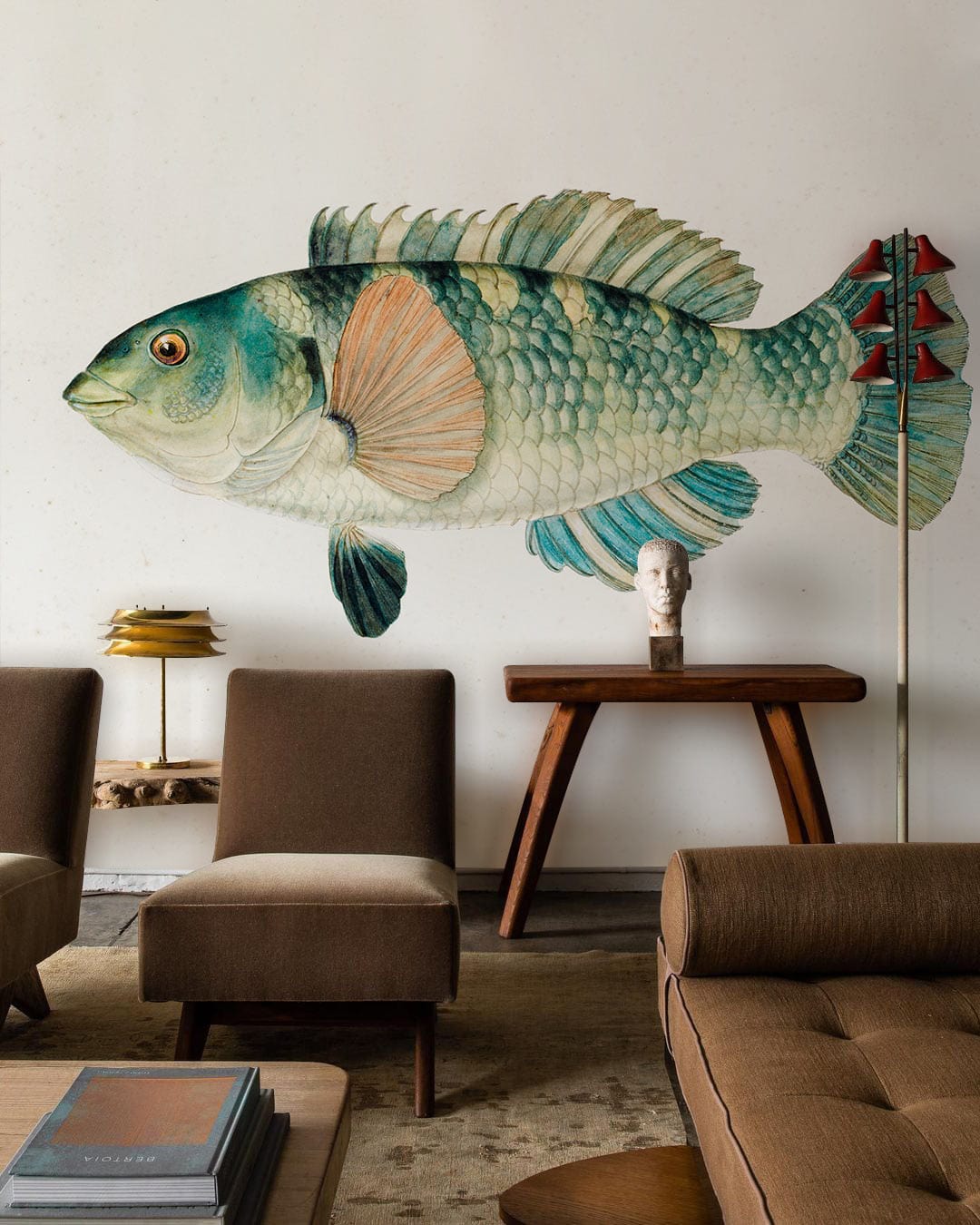 Eleva il tuo spazio con la nostra carta da parati Ever Wallpaper con illustrazione di pesci botanici vintage, che presenta una rendering dettagliato e artistico di un pesce tropicale che porta un tocco della bellezza della natura nella tua casa. Perfetta per creare un'atmosfera serena in qualsiasi stanza.
