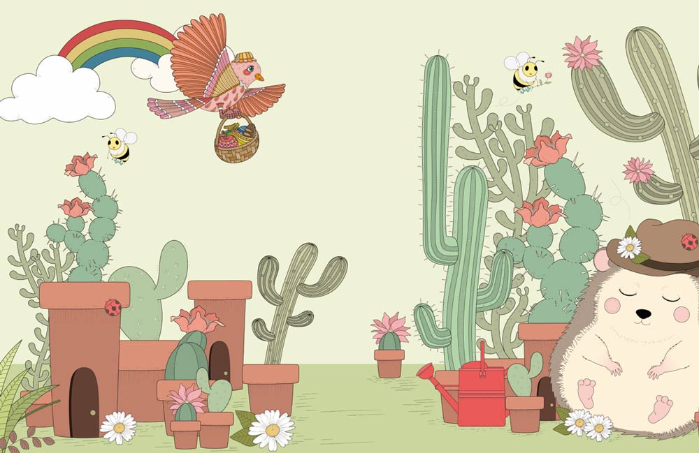 Trasforma la stanza di tuo figlio in un'oasi del deserto fantastica con la nostra Colorful Desert Adventure Kids Wallpaper. Con ricci divertenti, affascinanti cactus e un sottile arcobaleno, questa carta da parati è perfetta per stimolare l'immaginazione e la meraviglia.