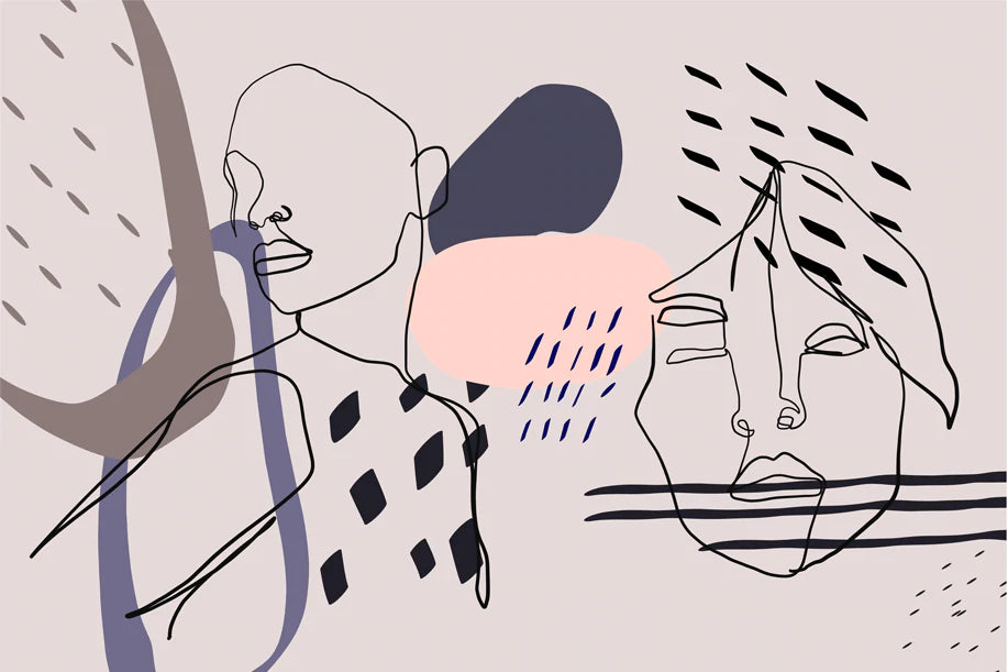 Trasforma il tuo spazio con questa carta da parati moderna che presenta disegni lineari artistici di volti astratti su uno sfondo neutro. Ideale per aggiungere un tocco contemporaneo e un pezzo d'arte conversazionale a qualsiasi stanza.