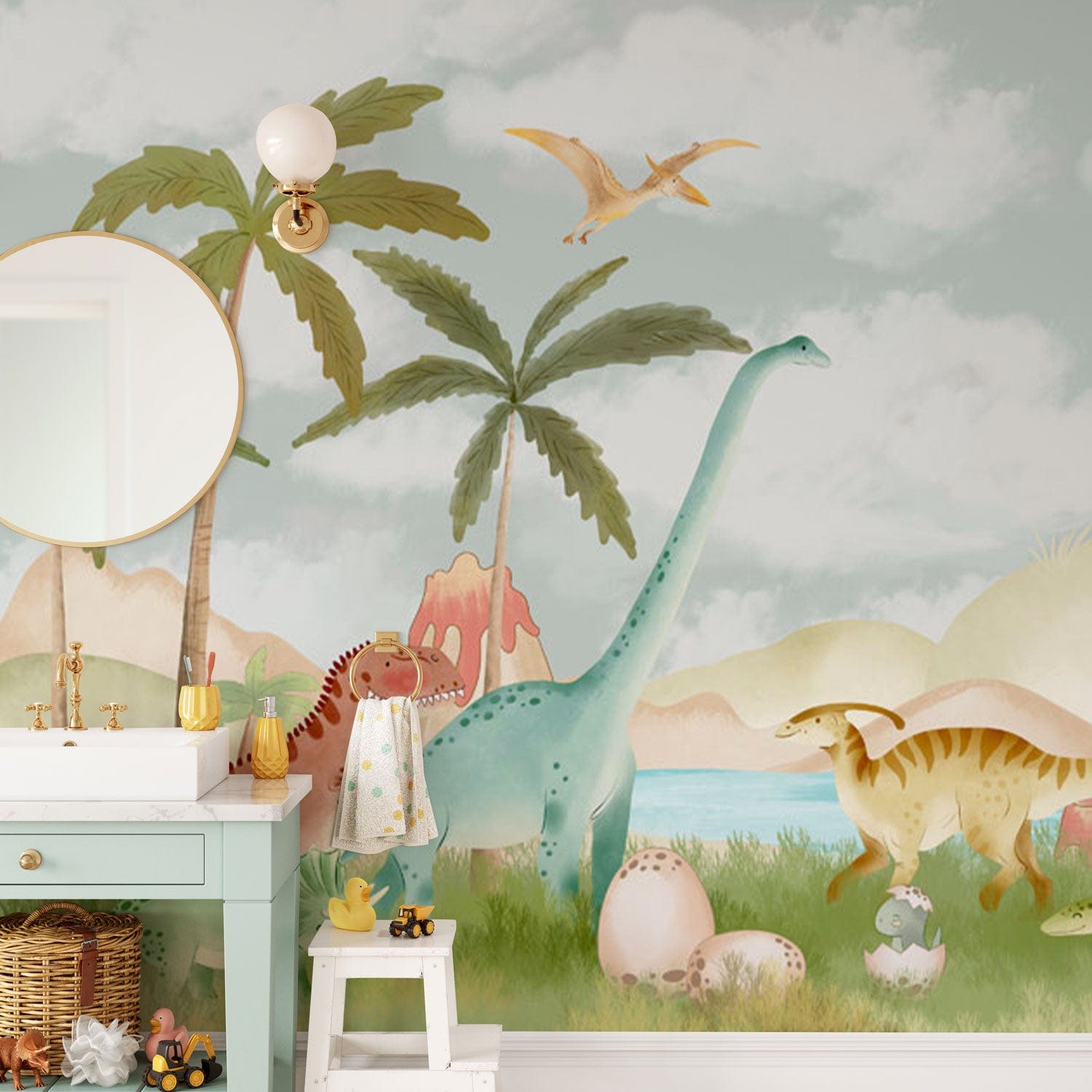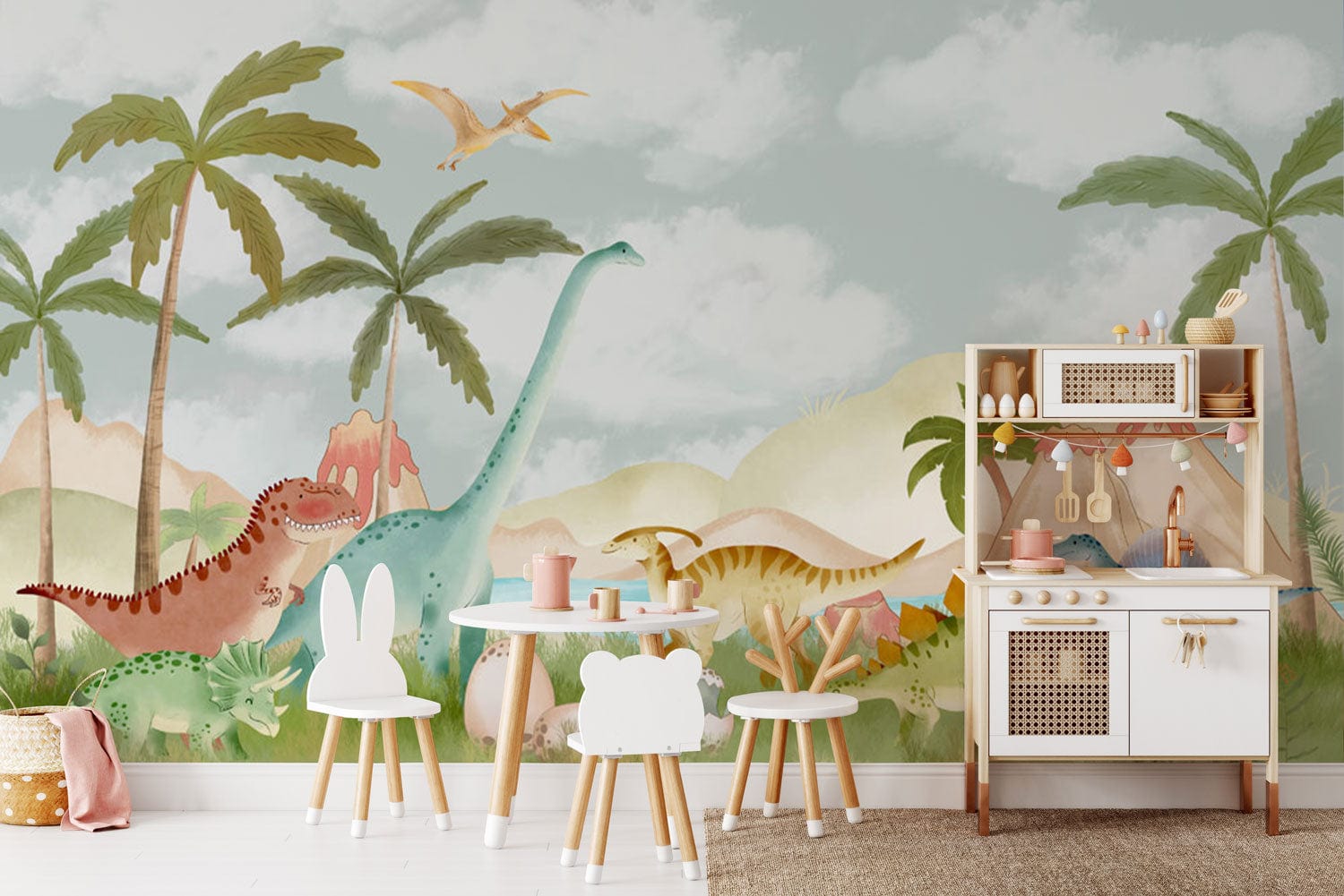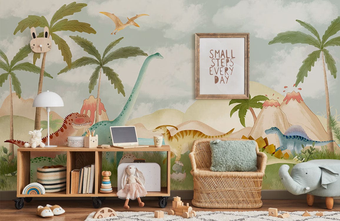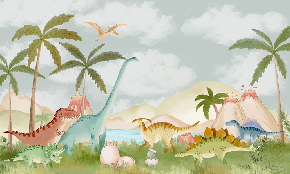 Trasforma la stanza di tuo figlio in un parco giochi preistorico con questa affascinante carta da parati a tema dinosauri. Caratterizzata da illustrazioni giocose di dinosauri amichevoli in morbidi colori pastello, questo rivestimento murale è perfetto per stimolare l'immaginazione e l'avventura in qualsiasi spazio per bambini.