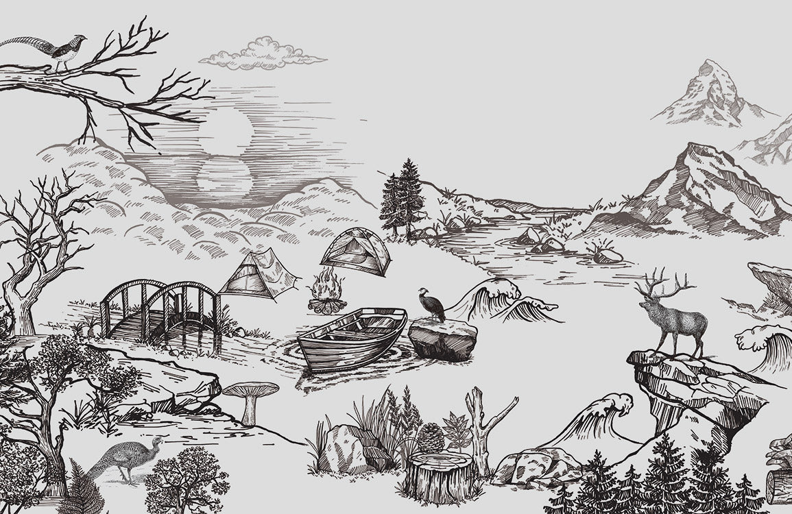 Immergiti nella grande natura con la nostra carta da parati Nature Landscape Sketch. Questa rappresentazione artistica cattura l'essenza serena dei paesaggi naturali in uno stile di schizzo monocromatico, perfetto per creare un ambiente tranquillo nel tuo spazio.