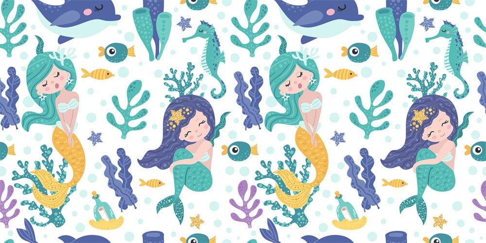 Trasforma la stanza di tuo figlio in un'oasi subacquea magica con la nostra carta da parati per bambini Whimsical Mermaid Ocean. Caratterizzata da sirene giocose, creature marine amichevoli e flora marina, questo design incantevole stimolerà l'immaginazione e aggiungerà un tocco di colore a qualsiasi stanza.