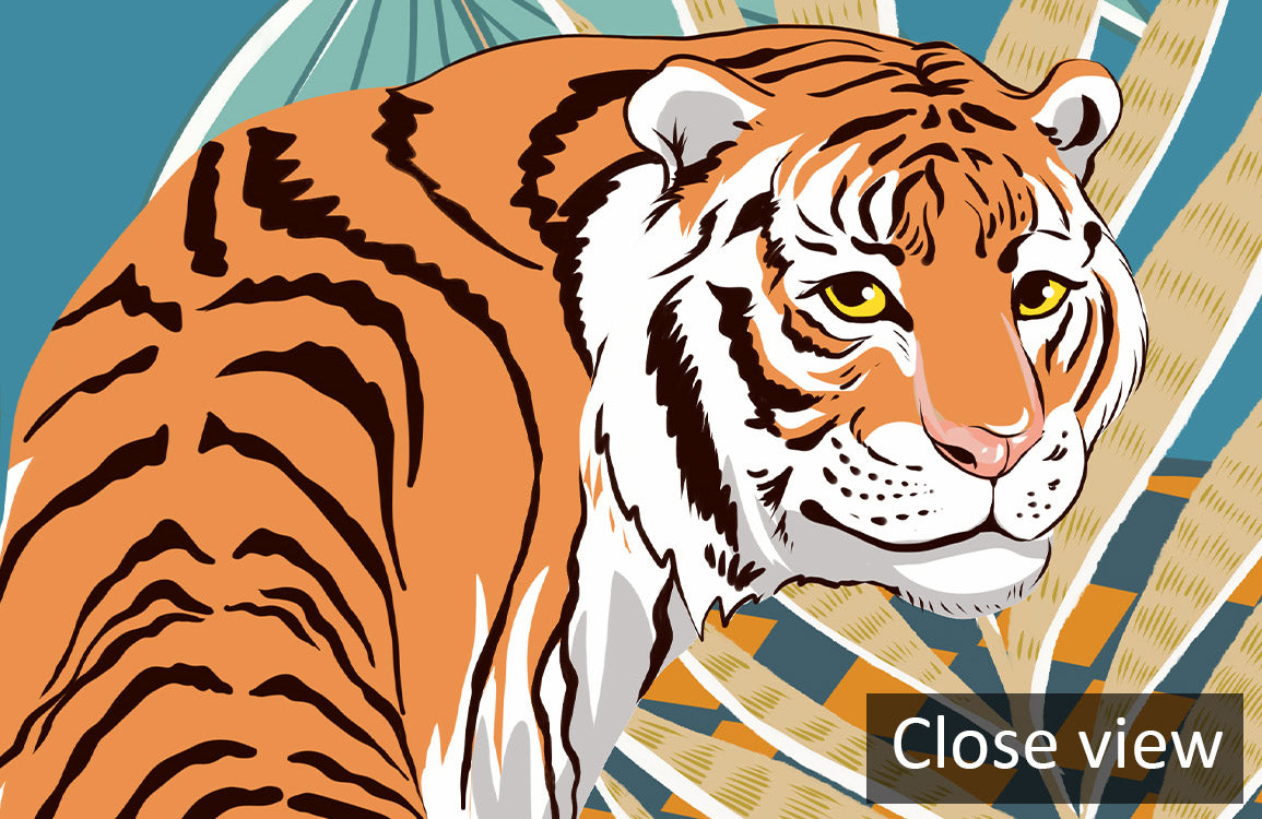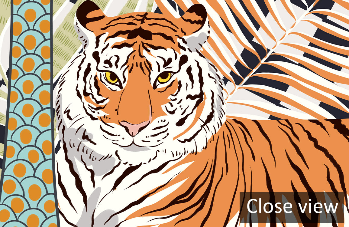 Trasforma il tuo spazio con la nostra vivace carta da parati a tema giungla con tigri eclectic. Questo design unico presenta una combinazione di tigri audaci, fogliame esotico e geometriche astratte, perfetto per creare una parete d'effetto in qualsiasi stanza.