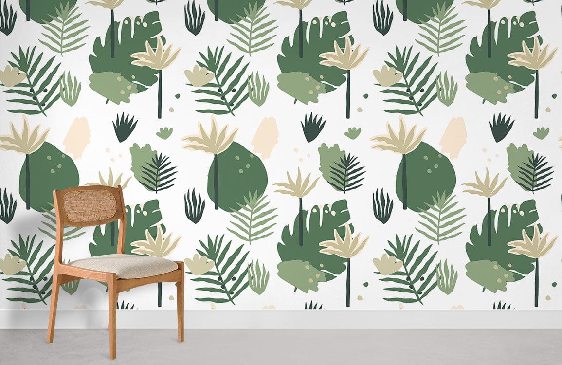 Eleva il tuo spazio con questa lussureggiante carta da parati con stampa di foglie botaniche tropicali. Caratterizzata da una fusione armoniosa di tonalità verdi e delicati motivi botanici, è perfetta per creare un'atmosfera serena e naturale nella tua casa.