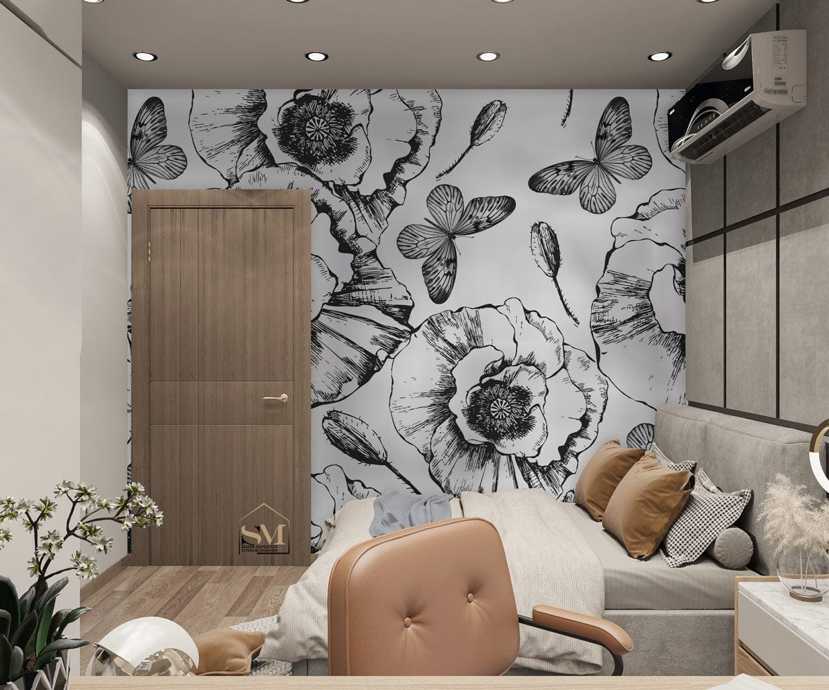 Muro di Carta da Parati Vettoriale Nero e Bianco con Papaveri