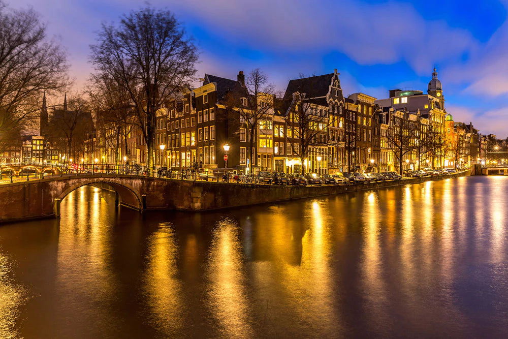 Cattura la bellezza serena dei canali iconici di Amsterdam con questa carta da parati paesaggistica di alta qualità. Perfetta per portare un tocco di eleganza europea e la calma del crepuscolo in qualsiasi stanza.