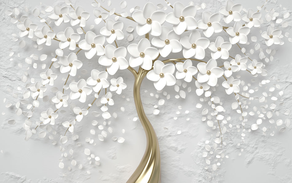 Transform your space with our Elegant White Floral 3D Wallpaper, featuring a luxurious blend of white blossoms and gold accents on a textured background. Perfect for creating a serene and sophisticated ambiance in your living room, bedroom, or powder room.