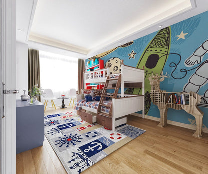 Ignite the imagination of little explorers with our Colorful Space Adventure Kids Wallpaper. Perfect for creating a playful ambiance in a child's bedroom or play area, this wallpaper features vibrant illustrations of astronauts, rockets, and celestial bodies on a charming blue backdrop.