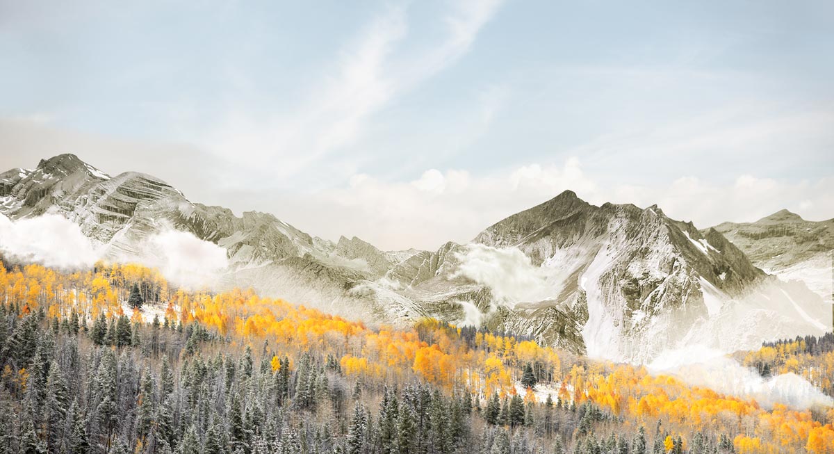 Transform your space with our Autumn Mountain Forest Landscape Wallpaper. This stunning mural brings the serene beauty of nature into your home, featuring a breathtaking autumnal forest scene set against majestic snow-capped mountains.