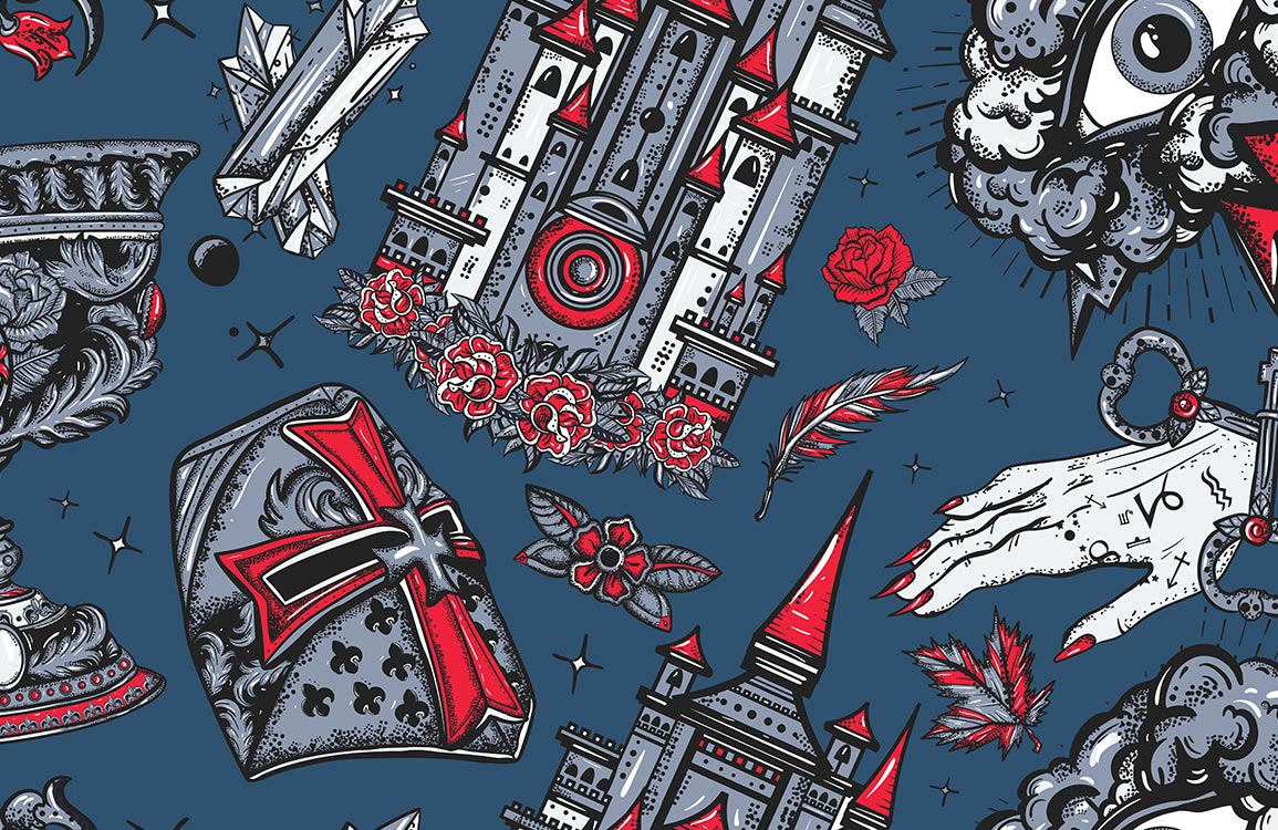 Transform your space with this captivating Gothic Medieval Fantasy Pattern Wallpaper. Perfect for creating a dramatic and whimsical atmosphere, this design features intricate gothic illustrations on a rich blue background, suitable for a variety of stylish interiors.