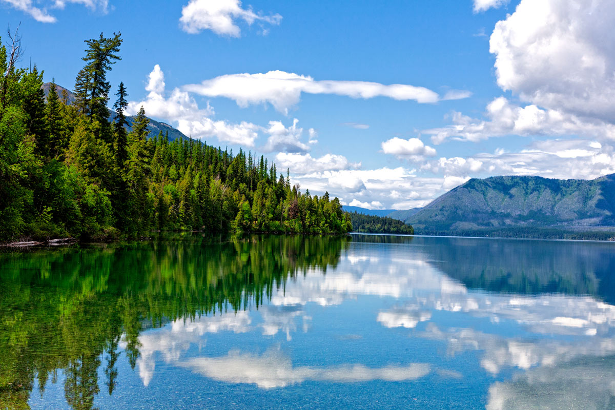 Transform your space with this serene lake and forest landscape wallpaper. Perfect for creating a tranquil atmosphere, this high-quality, durable wall covering brings nature's beauty indoors, featuring rich blue hues and lush green tones.