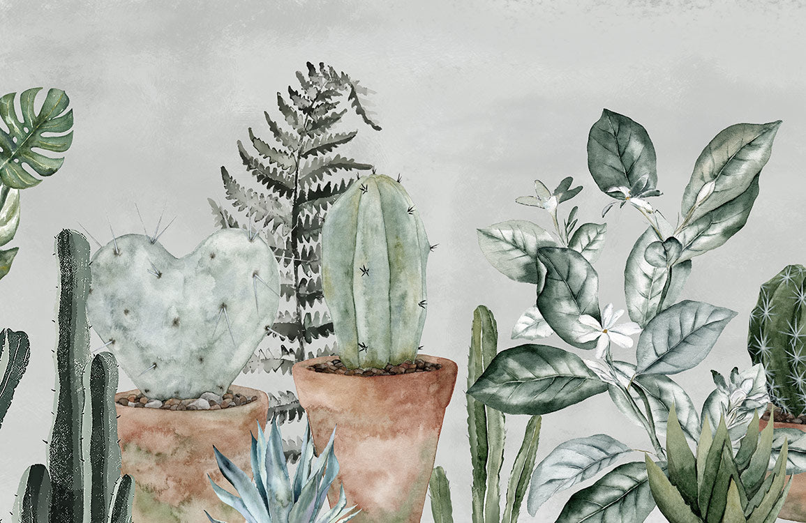 Capture nature's tranquility with our Botanical Cactus Watercolor Wallpaper, an ideal choice for creating a calming and serene space. The delicate watercolor cacti and succulents set on a soft grey background add a touch of elegance and relaxation to any room.