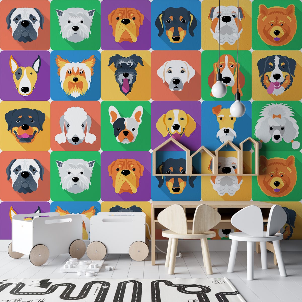 Brighten up any room with this vibrant, playful wallpaper featuring a variety of cheerful canine portraits. Perfect for adding a dash of joy and color to your space, this wallpaper celebrates beloved dog breeds with a modern, illustrative twist.