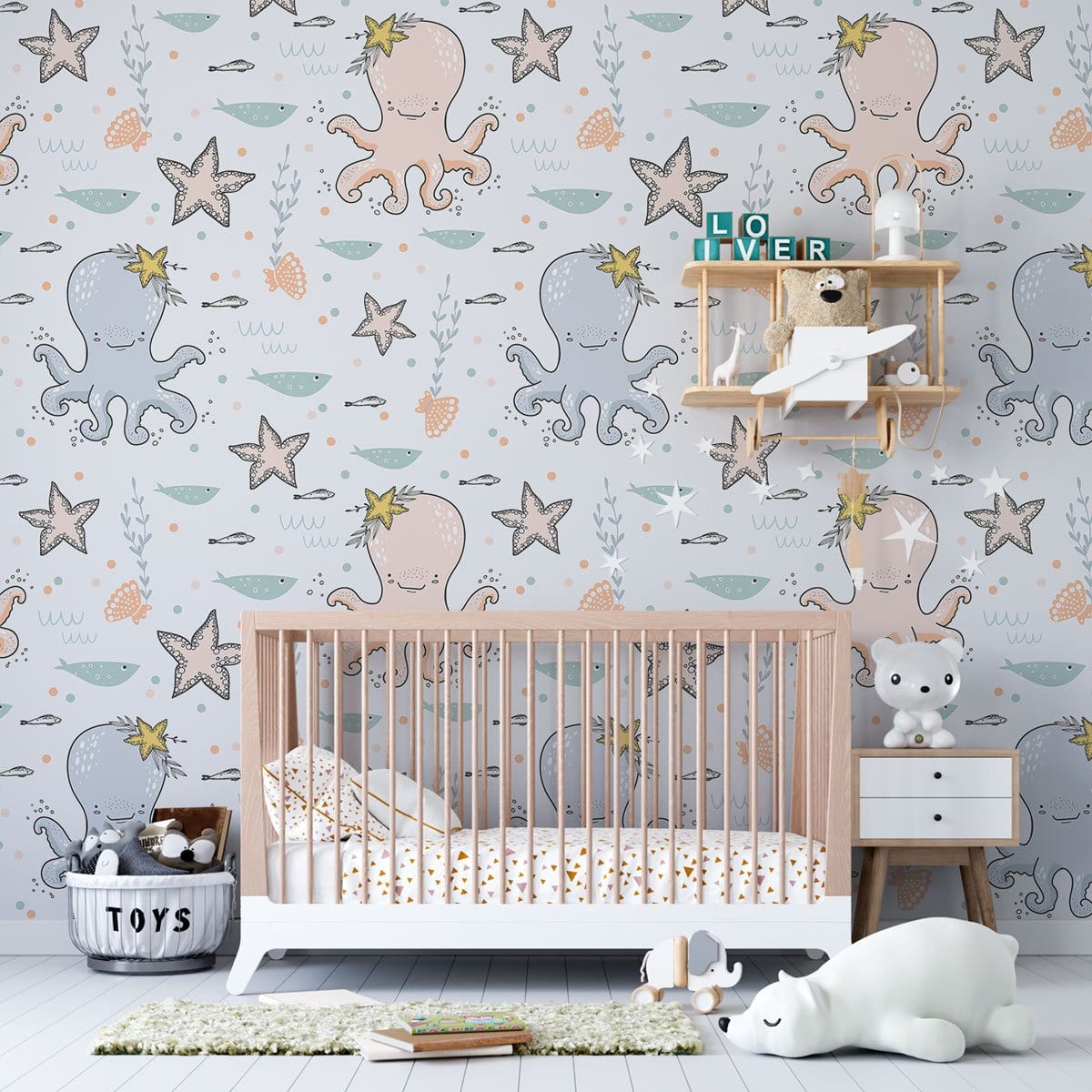 Dive into a marine world with our Underwater Adventure Wallpaper, perfect for sparking imagination in a child's space. Featuring playful octopuses, starfish, and gentle aquatic tones, this wall covering brings a touch of ocean wonder to any nursery or kids room.