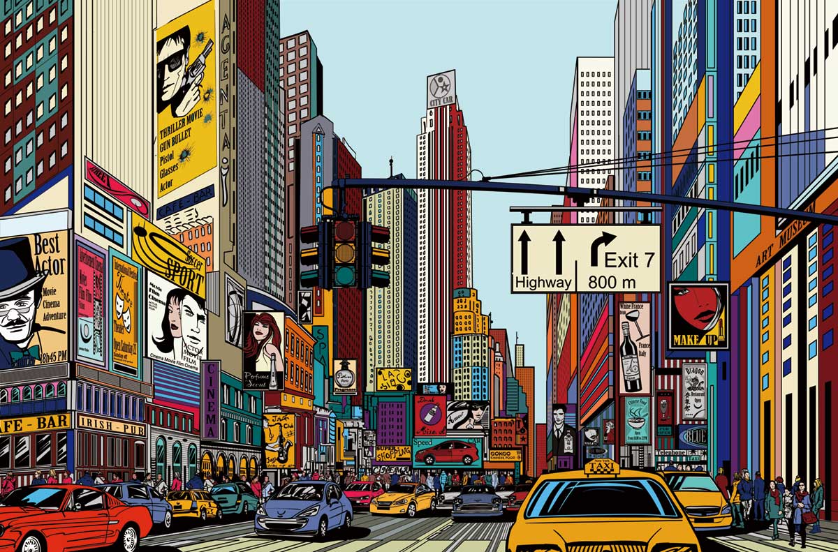 Transform your space with our art deco-inspired cityscape wallpaper mural. This colorful wall covering captures the urban vibrancy and lively streets with a unique artistic twist, perfect for creating a dynamic focal point in any room.
